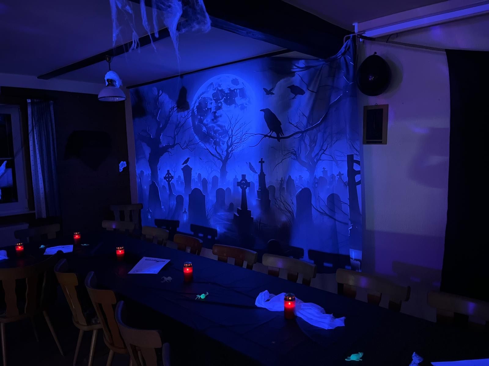 Ob zu Fuß oder mit Besen angereist – gemeinsam verbrachten alle einen geisterhaften Abend, bei dem selbst die Kürbisse vor Lachen fast vom Tisch gefallen wären. Die gruselig geschmückte SGV-Hütte bot den perfekten Rahmen für eine gespenstig-schöne Feier. Spinnweben hingen dekorativ von der Decke und überall konnte man sich von Gespenstern erschrecken lassen. Am Kinder-Gruselbuffet gab es schaurig-leckere Snacks und auch so manches Tanzbein wurde geschwungen.