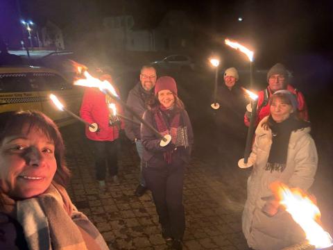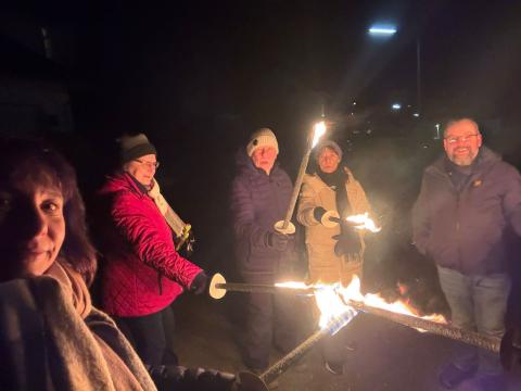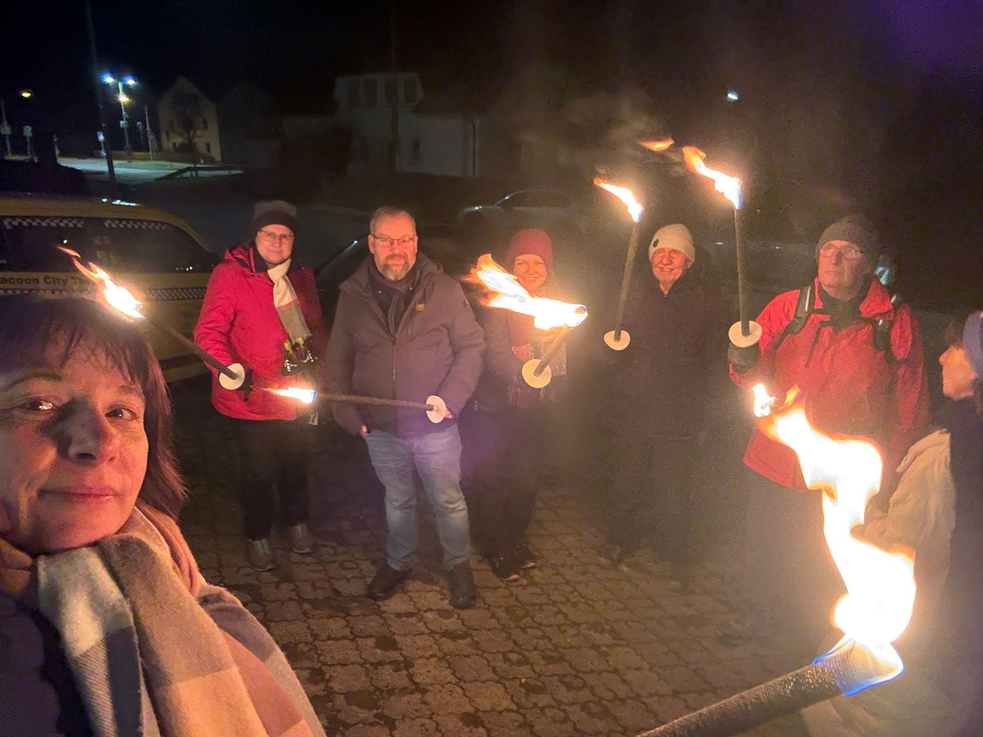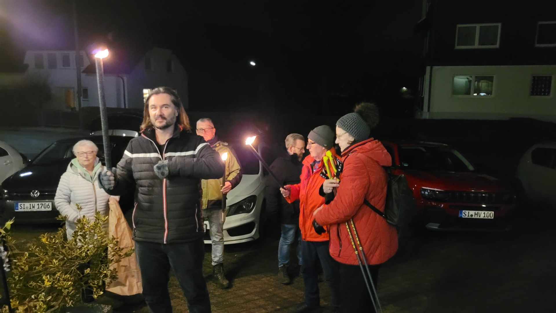 Unsere traditionelle Fackelwanderung wurde am Samstag, den 15.02.2025, durchgeführt. 13 Wanderer starteten um 15.00 Uhr von der Hütte aus über die Höhen von Flammersbach und Anzhausen bis zur Pizzeria Picco Bello. Nach einem gemeinsamen Abendessen wurden die Fackeln entzündet und es ging bei Feuerschein durch Wald und Feld zurück nach Flammersbach.