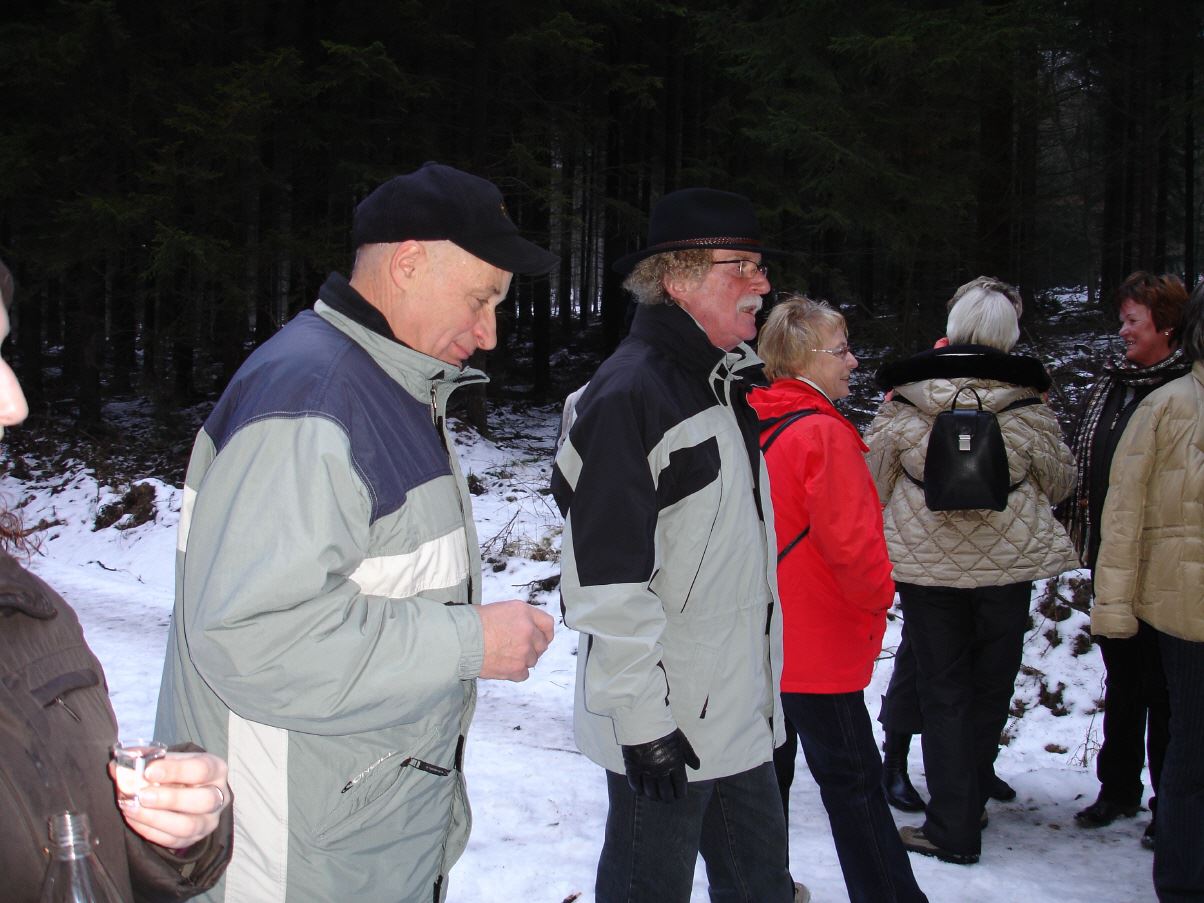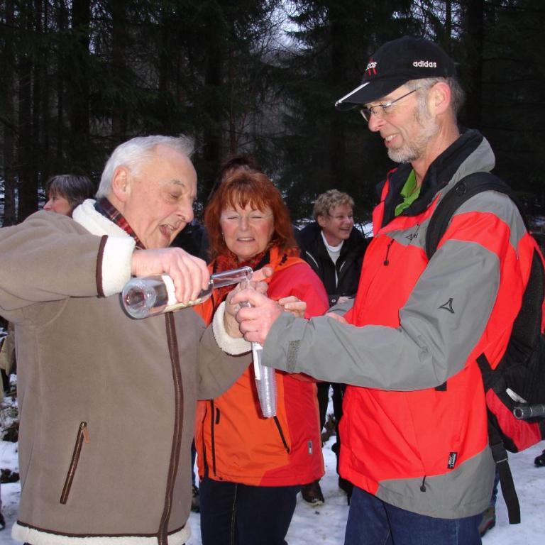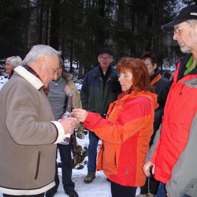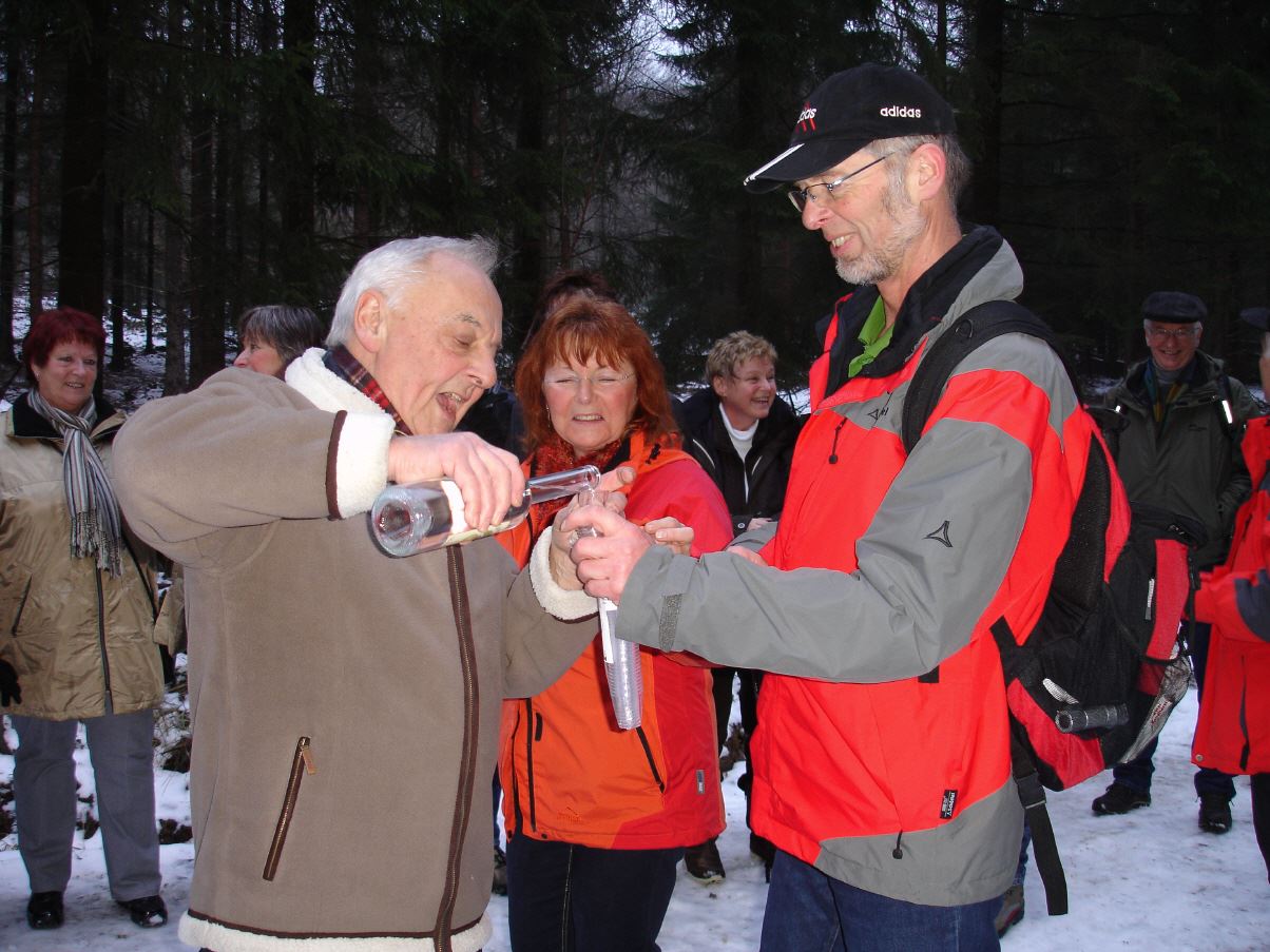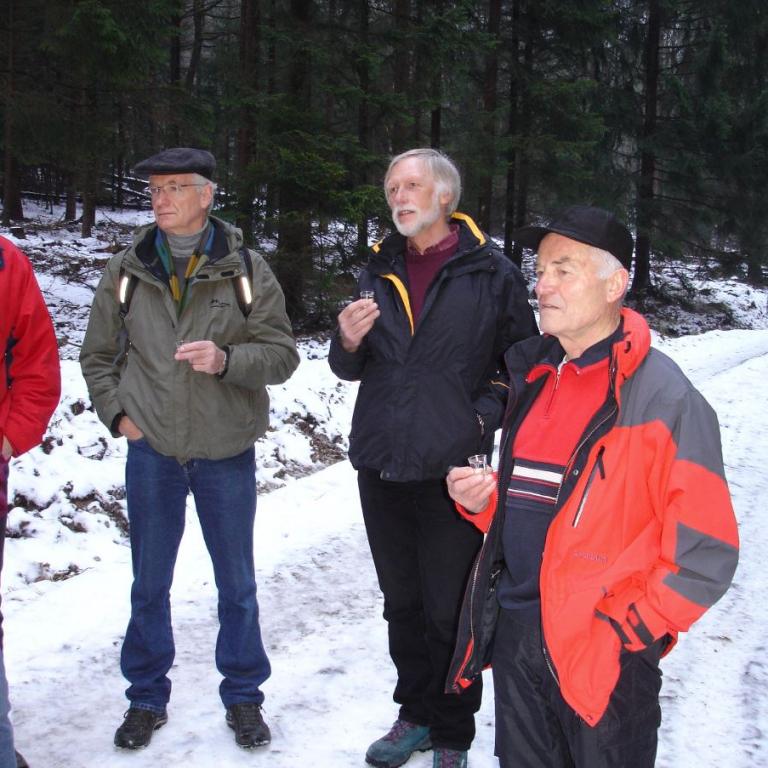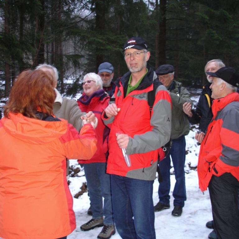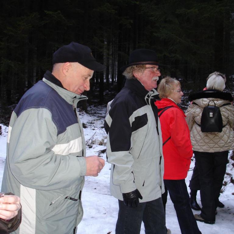 Regina und Rainer Müller hatten sich etwas einfallen lassen mit ihrer Wanderung zur Ilsenbraurei nach Littfeld. 26 Wanderfreunde trafen sich zur Fahrt mit Bus und Bahn nach Eichen. Von dort aus machte man eine Wanderung am Fuße des Kindelsbergs nach Littfeld. Die Wanderwege waren durch die Eisglätte nicht leicht zu begehen. Das Ziel Ilsenbrauerei erreichte man nach anderthalb Stunden. Hier gab es naturtrübes Bier und Schinkenbrote satt.