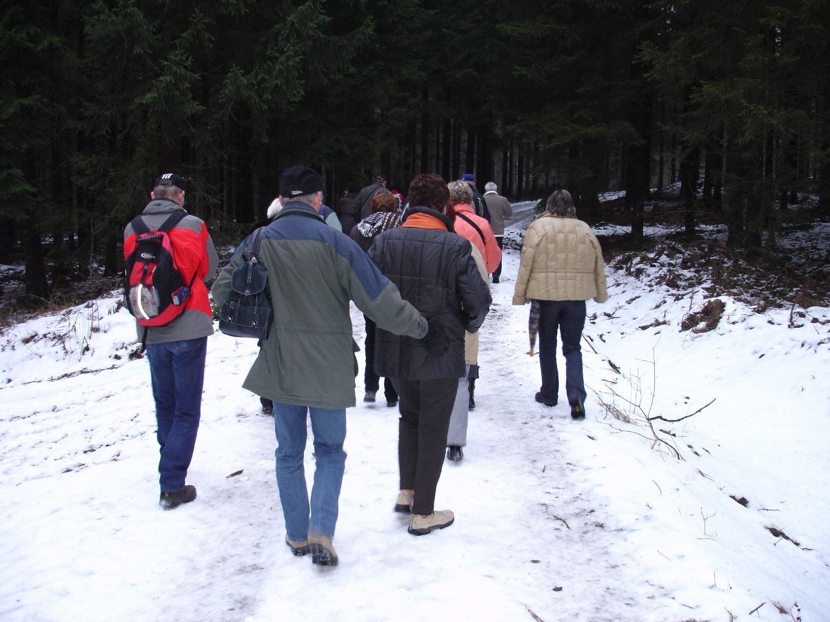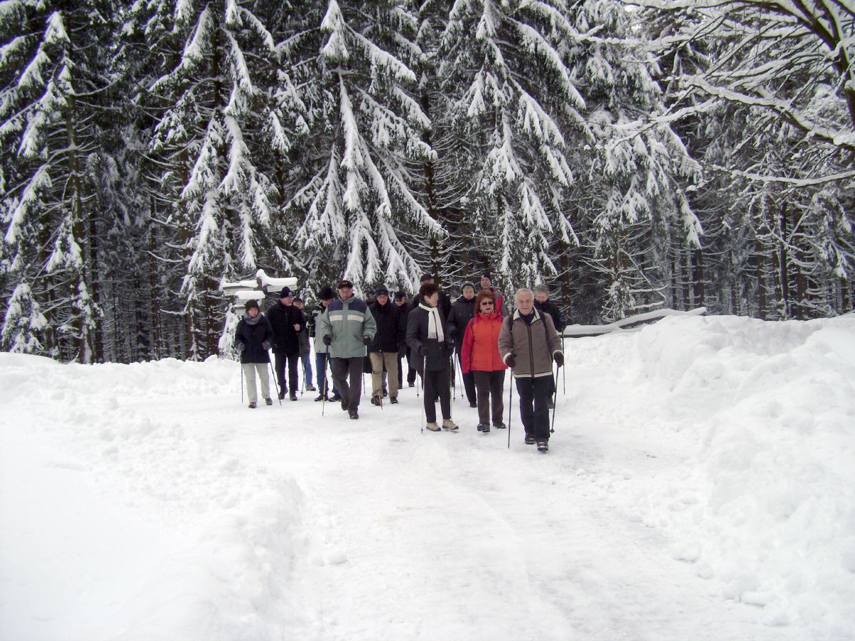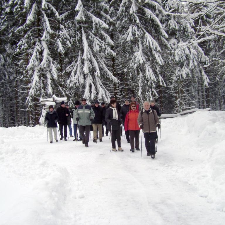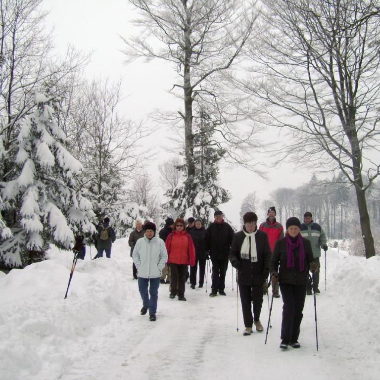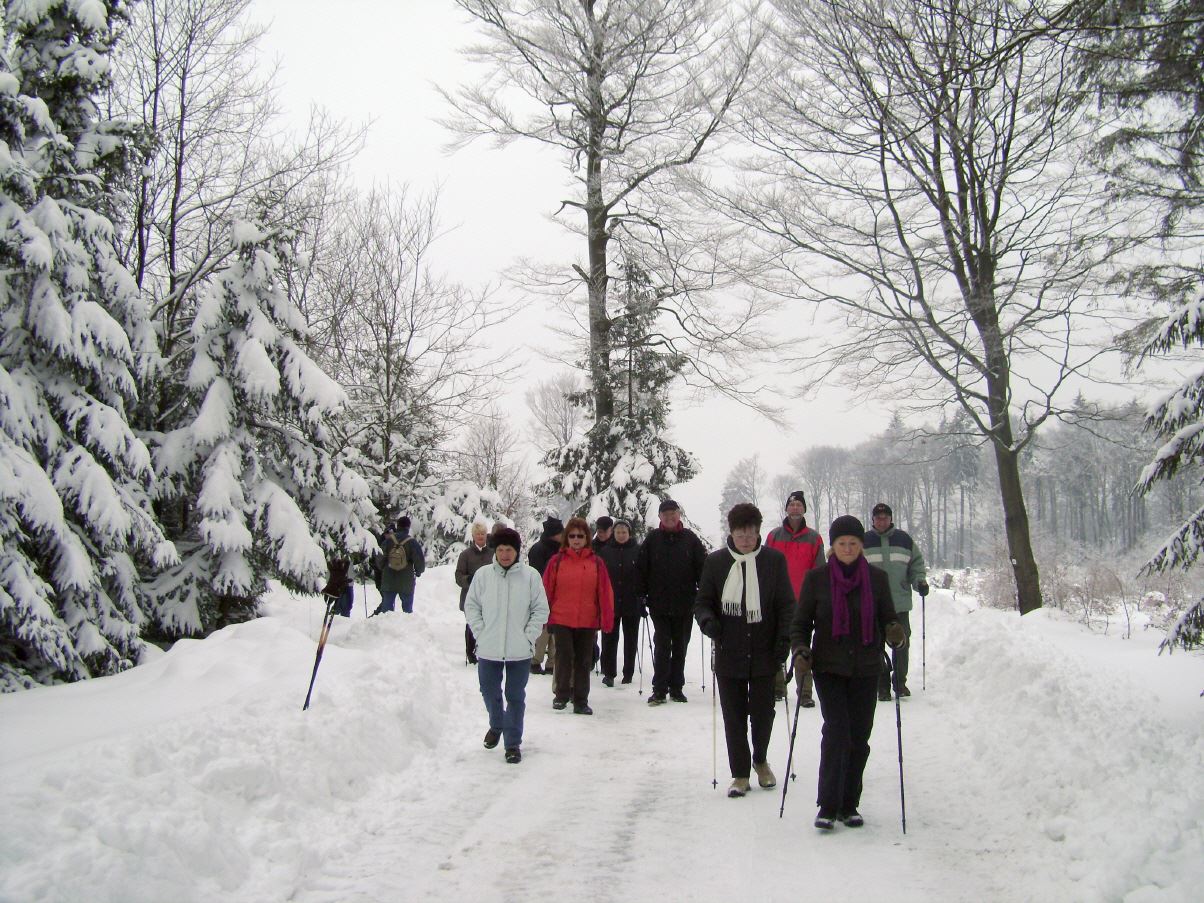 Eine Gruppe von 19 Wanderern traf sich um 10:30 Uhr am Parkplatz Hohenroth bei kaltem Winterwetter und hohem Schnee. Zunächst ging es zum Fernsehturm " auf der oberste Henn" und von dort an der Ederquelle vorbei. Ein Stück des Weges folgten wir dem Tal der jungen Eder, um dann durch die verschneiten Wälder an "Krämers Wiese" vorbei in einem Bogen zum Forsthaus Hohenroth zu gelangen. Die ursprünglich vorgesehene Strecke konnte nicht vollständig gewandert werden, da der hohe Schnee das Laufen zu beschwerlich machte. Um 12:30 Uhr haben wir dann mit 24 Personen in gemütlicher Runde das vorbestellte Mittagessen im Gasthaus Hohenroth zu uns genommen.