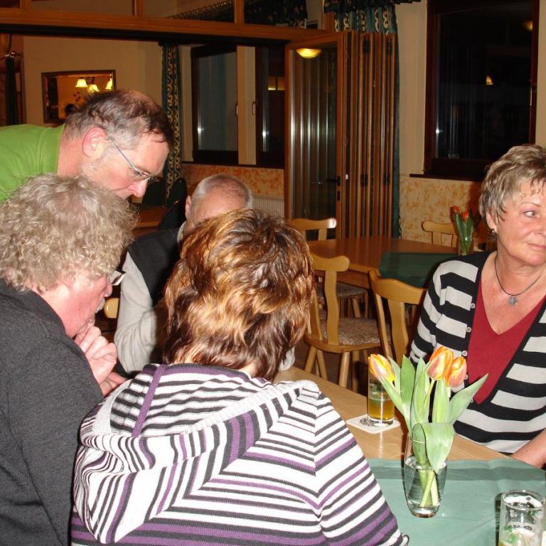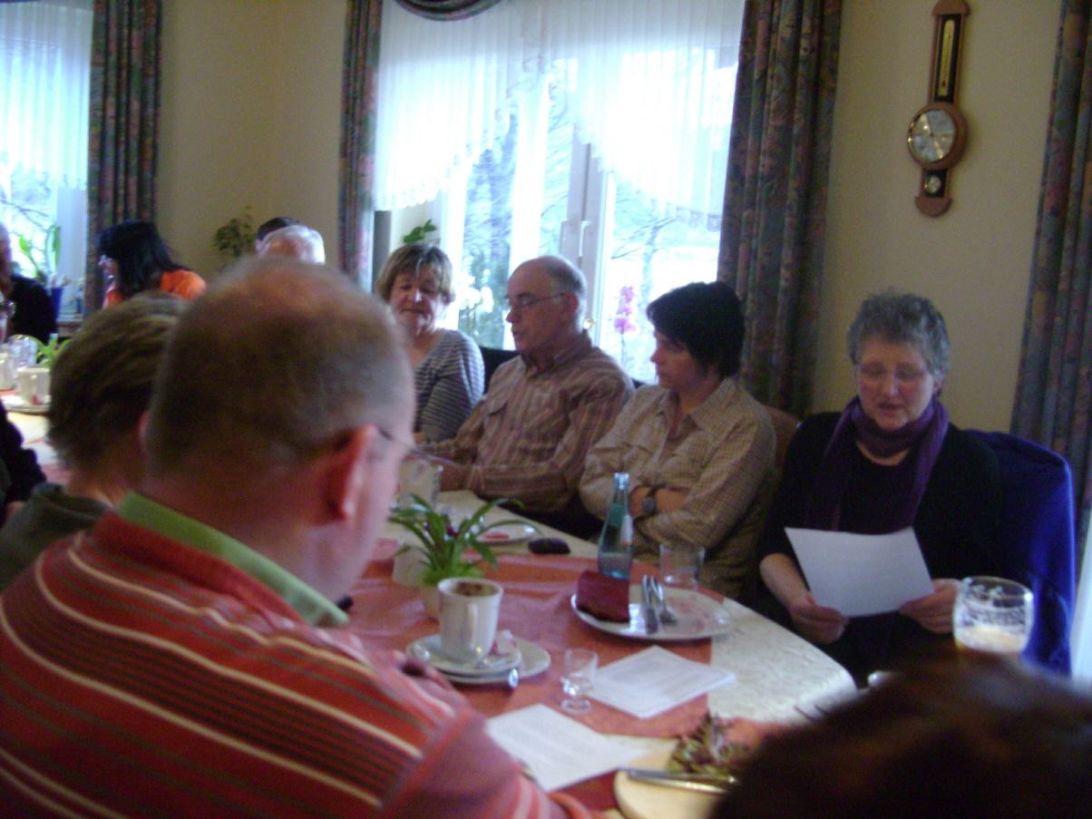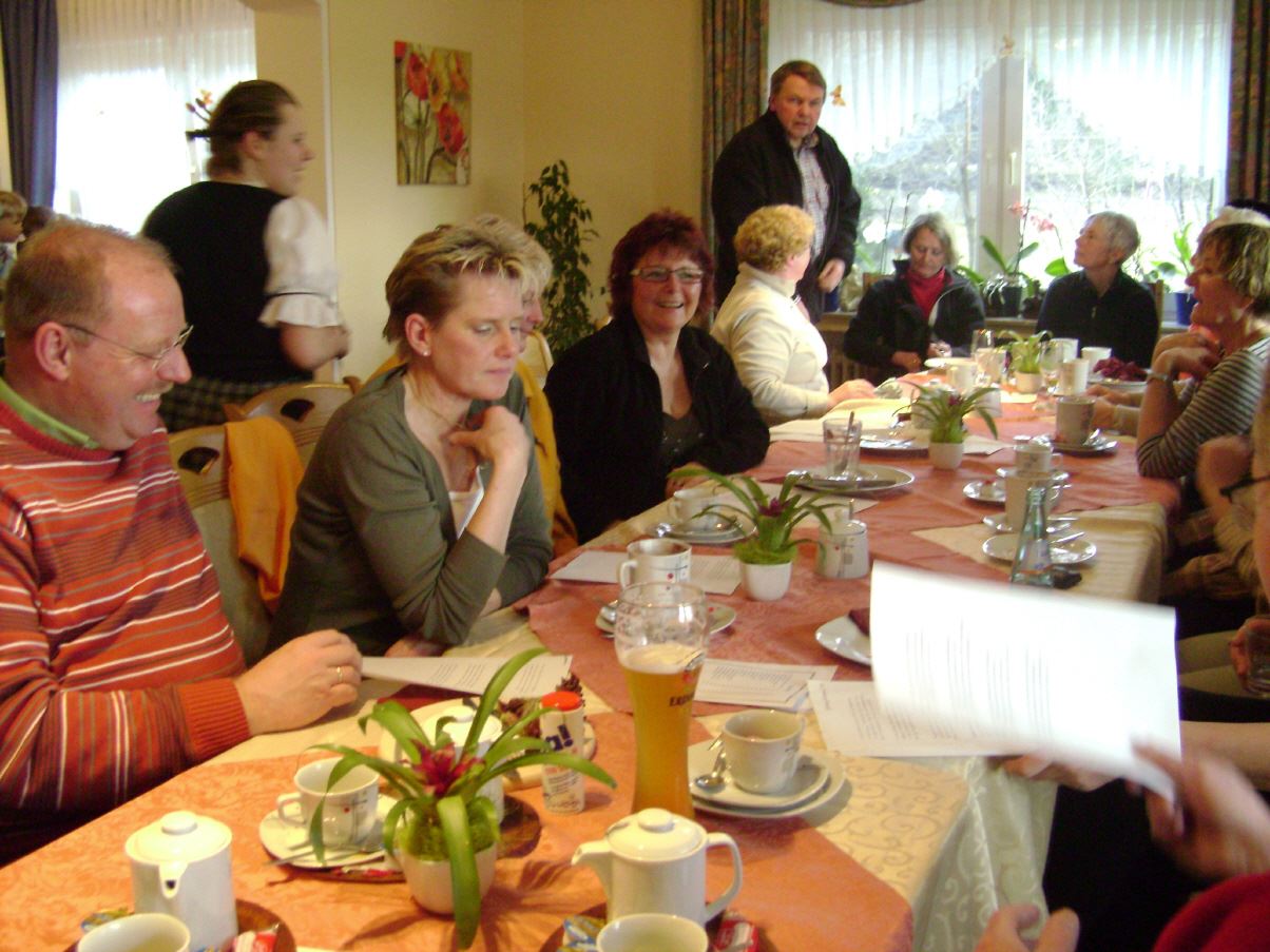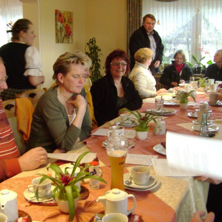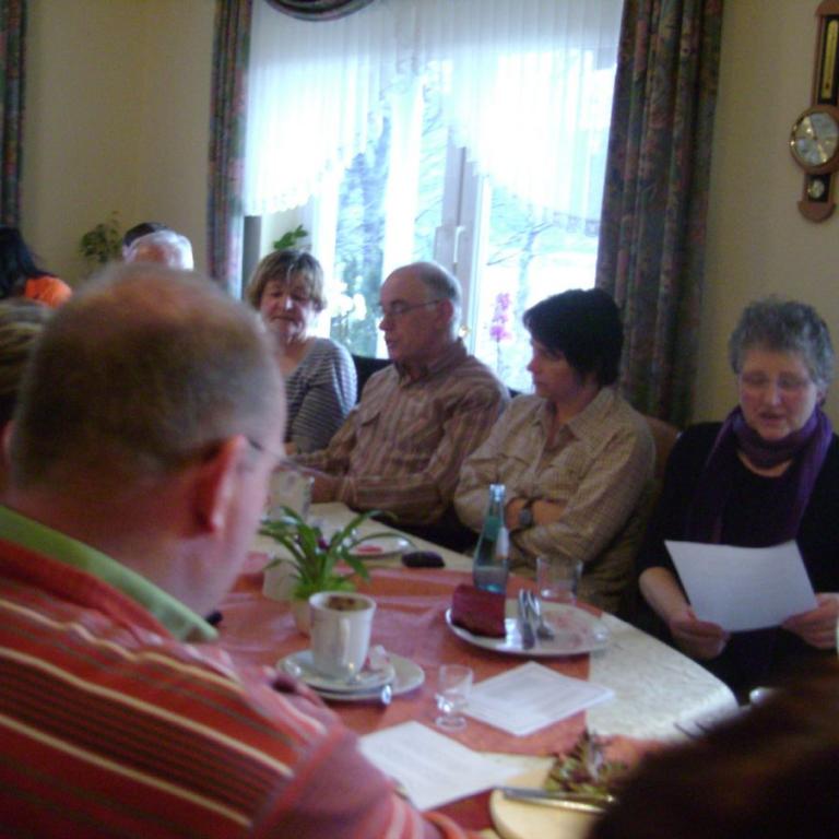 Danach liefen wir in einem Bogen an dem Ort Birkefeld vorbei wieder zum Ausgangspunkt. Da es auf der Strecke immer stärker regnete, wurde eine etwas kürzere Variante als geplant gelaufen. Nach zwei Stunden erreichten wir wieder das Bauernhof-Cafe, wo wir in froher Runde bei Kaffee und Kuchen zusammen saßen und langsam wieder trocken wurden. Die Teilnehmer waren sich einig, dass keiner alleine bei diesem Wetter in die Natur gegangen wäre. Alle waren froh, dass sie trotz des schlechten Wetters 2 Stunden lang stramm gewandert waren. Fotos haben wir nur im Cafe gemacht, da es wegen des starken Regens draußen nicht möglich war.
