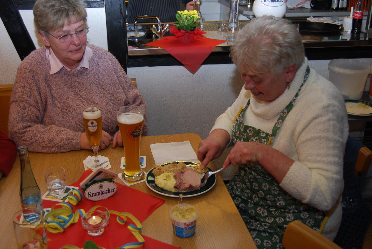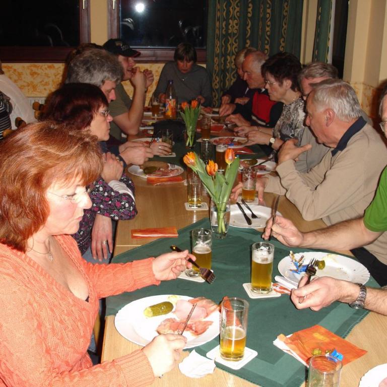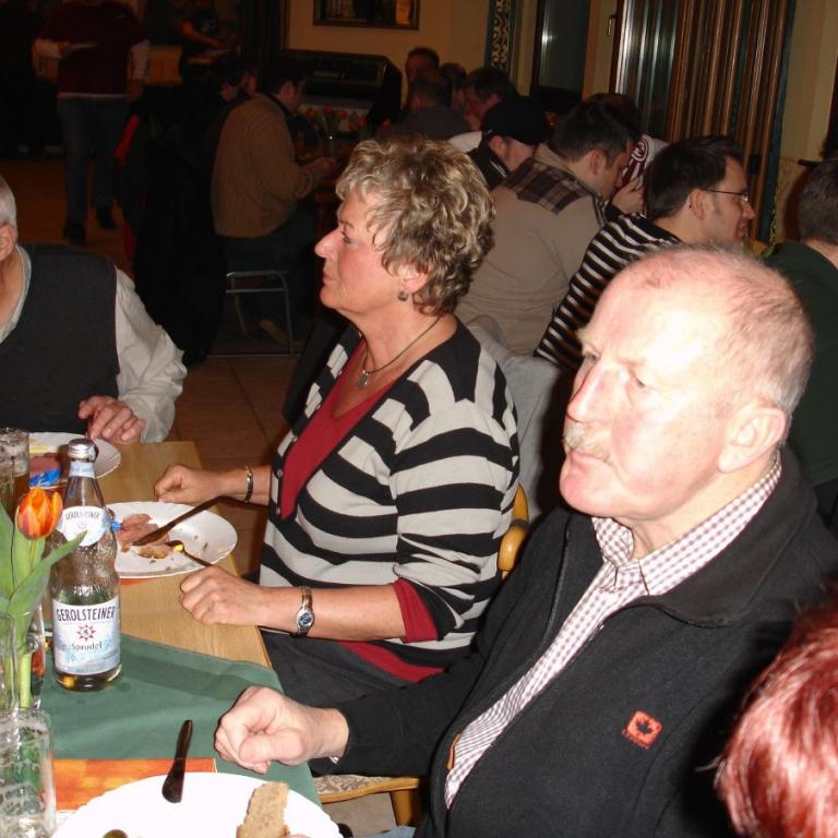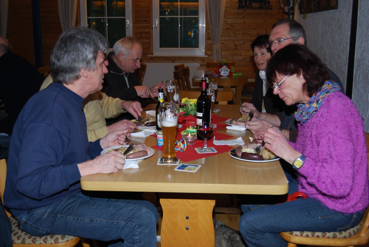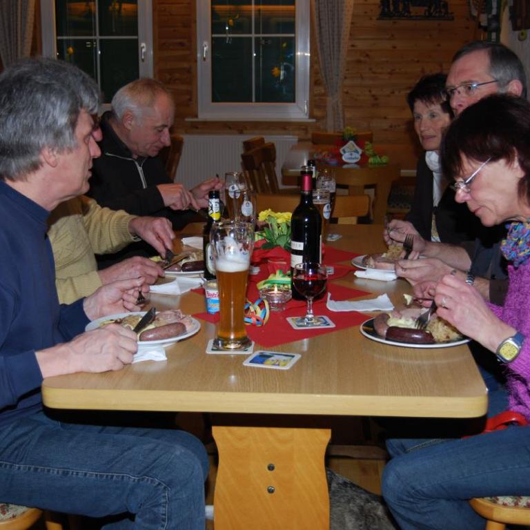 Zum Schlachtfest trafen sich rund 40 Wanderfreunde in der SGV Hütte. Es gab Deftiges. Rosi und Karl-Heinz Schneider hatten hatten Schlachtplatten mit Blut- und Leberwurst, Frankfurter Rippchen mit Sauerkraut und Kartoffelpüree vorbereitet. Alle Besucher des Schlachtfestes ließen es sich wohlergehen. Man hatte viel Spaß und das Fest endete weit nach Mitternacht.