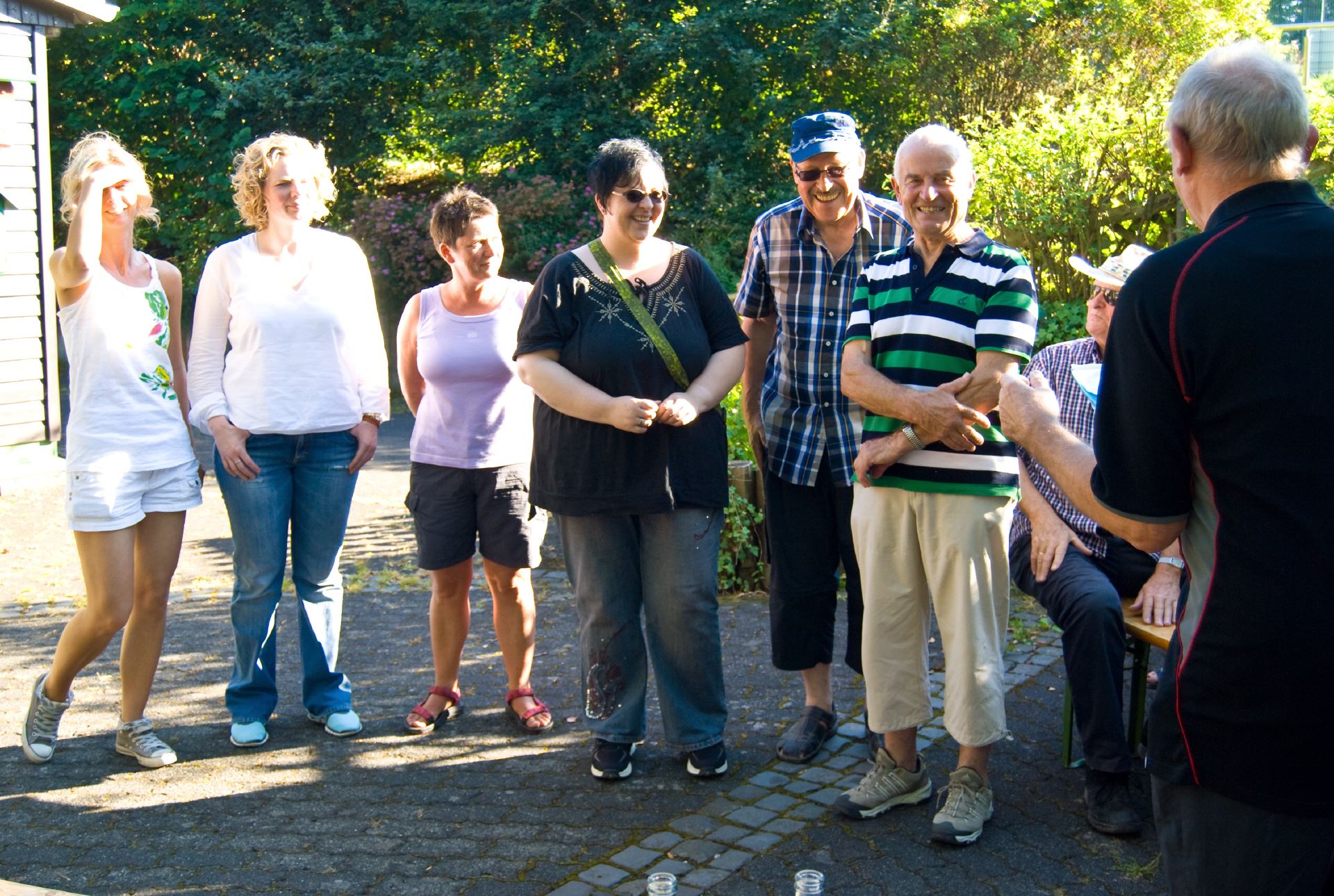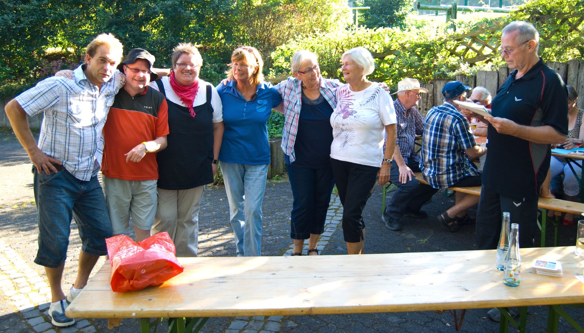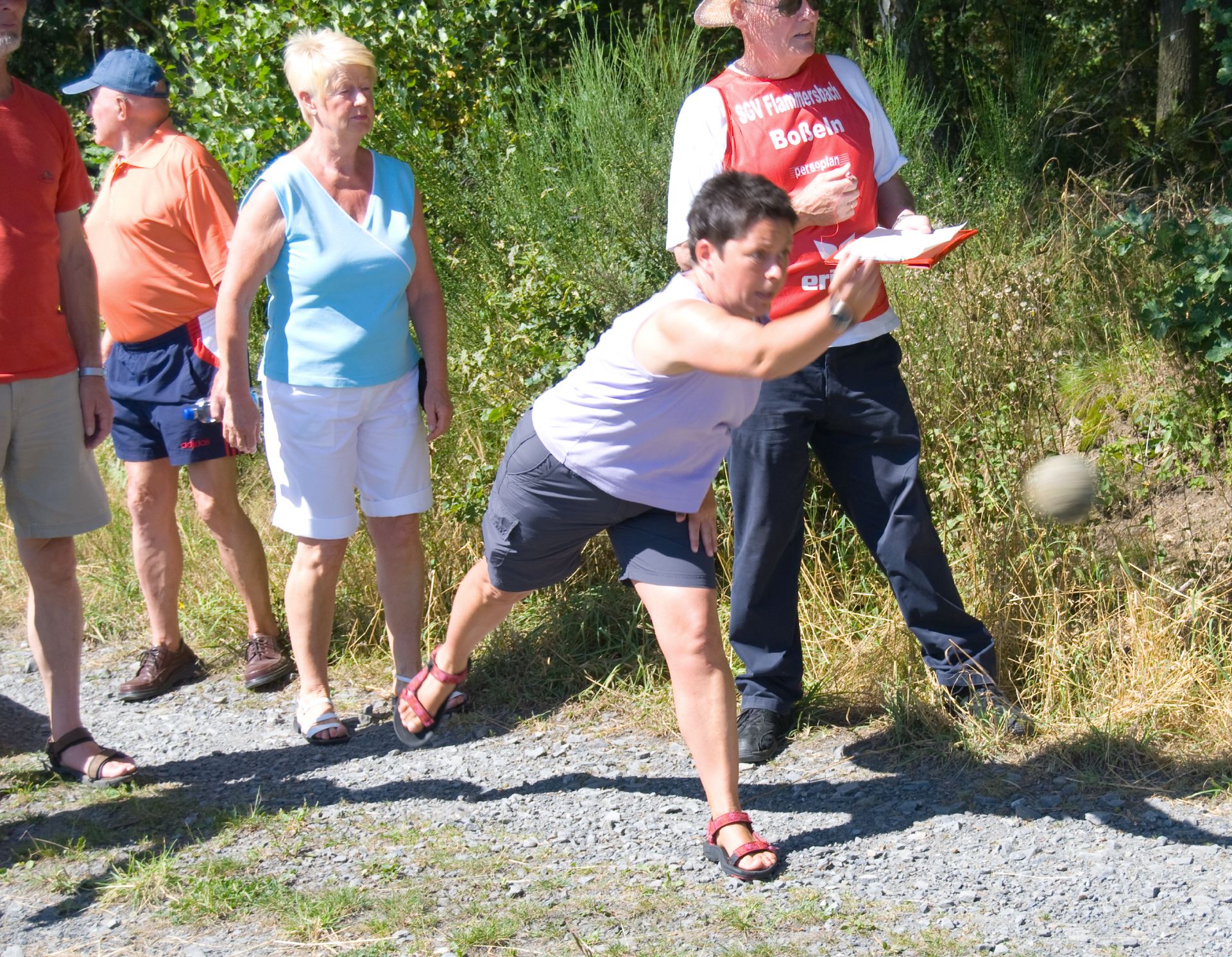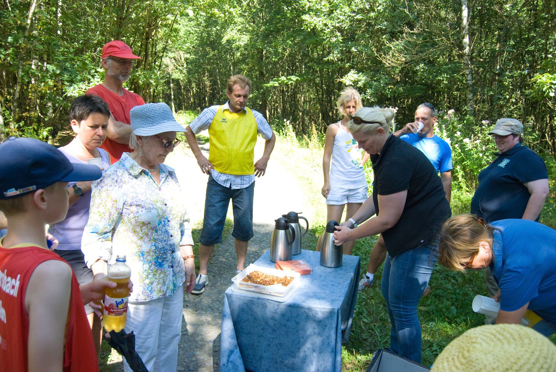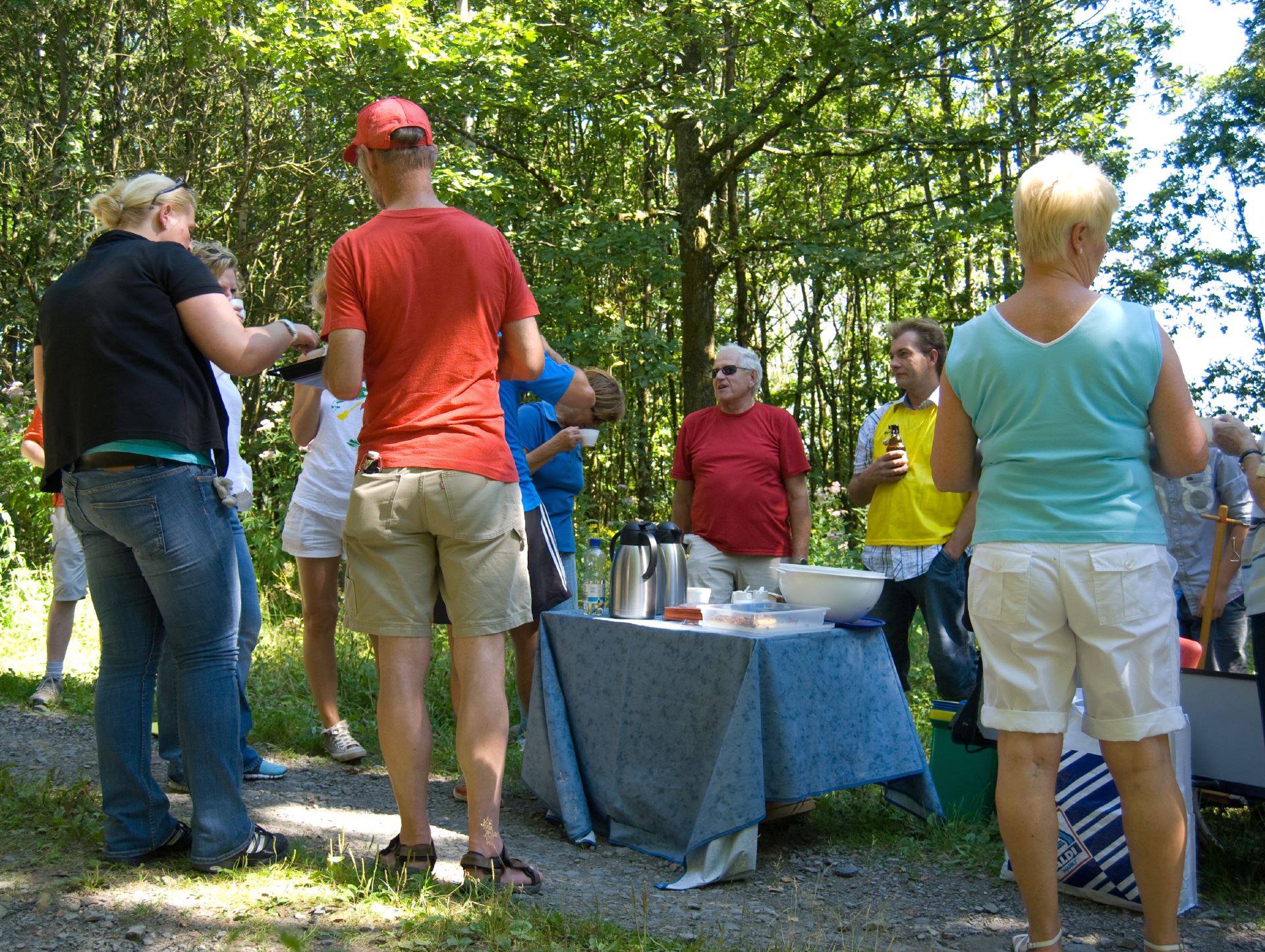 Bereits zum 13. Mal hatte der Singkreis des SGV zum Boßeln eingeladen. 28 Boßler und 5 Gäste hatten sich angemeldet. Wegen des heißen Wetters wurde die Boßelstrecke verkürzt und in den schattigen Wald verlegt, was dann viele als interessante Lösung ansahen. Nach halber Strecke war im Wald der Tisch gedeckt (sogar mit Tischdecke) und es gab Kaffee und Kuchen.
