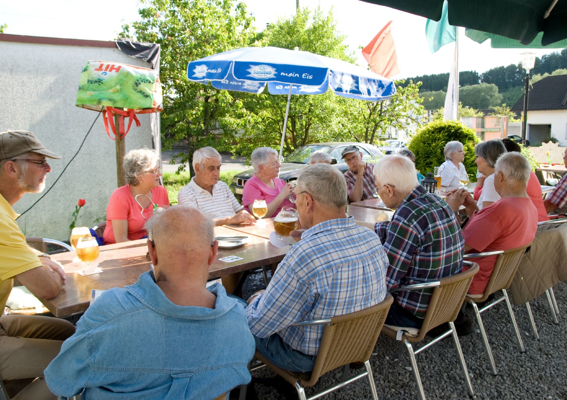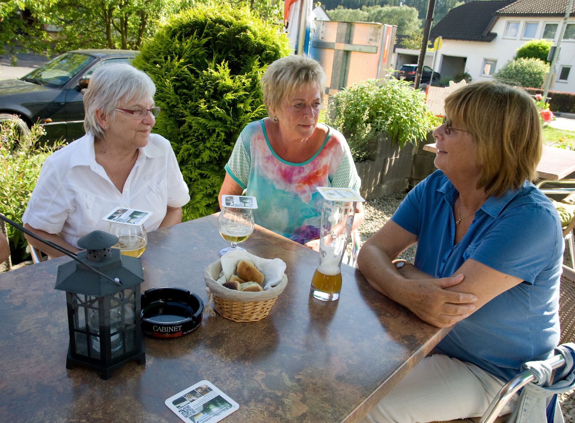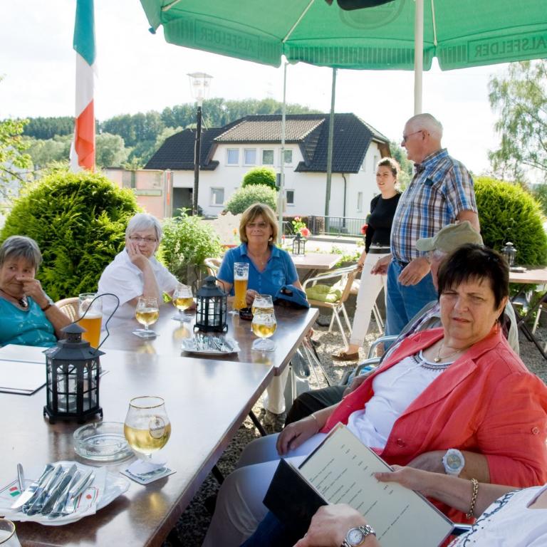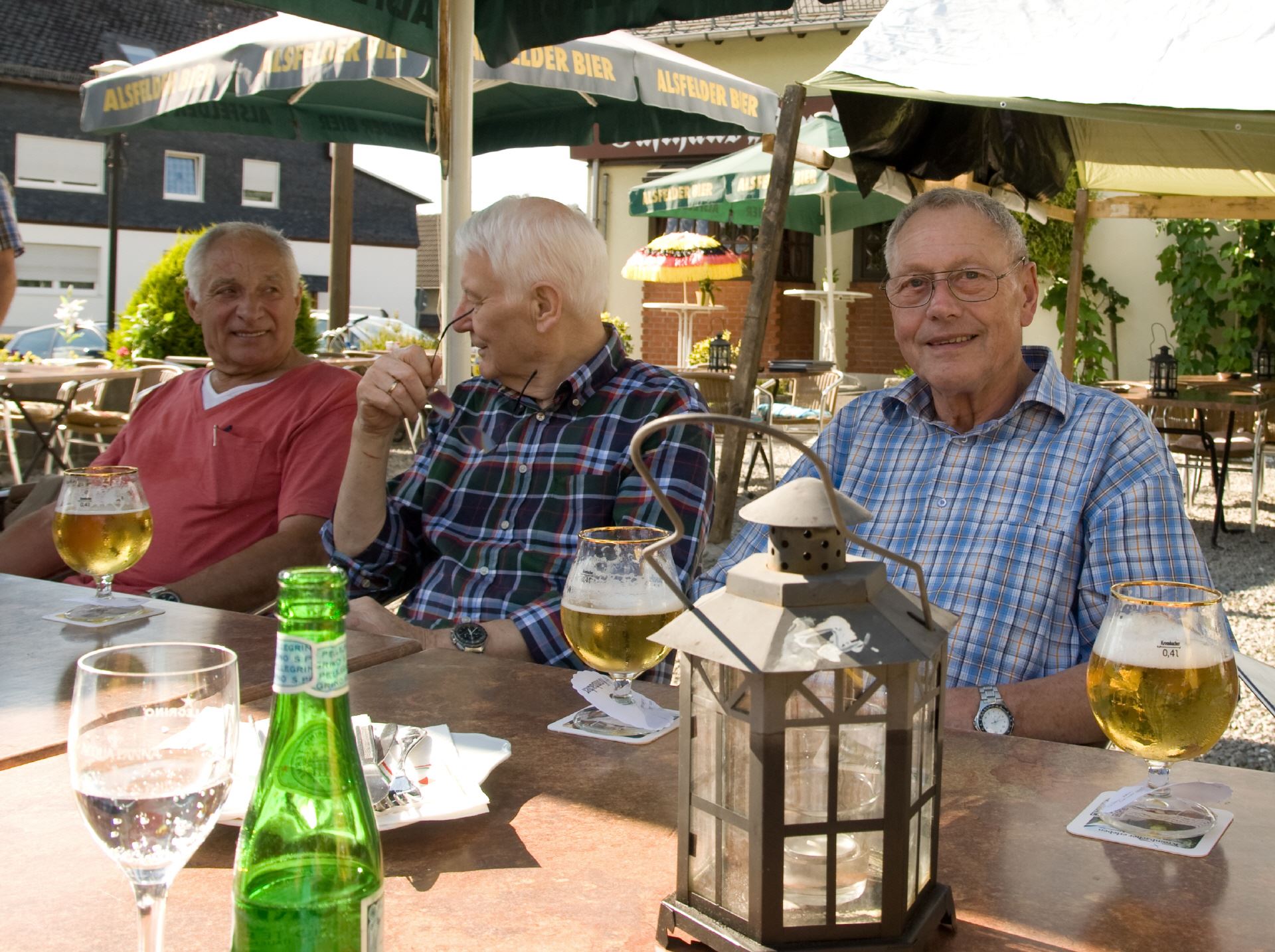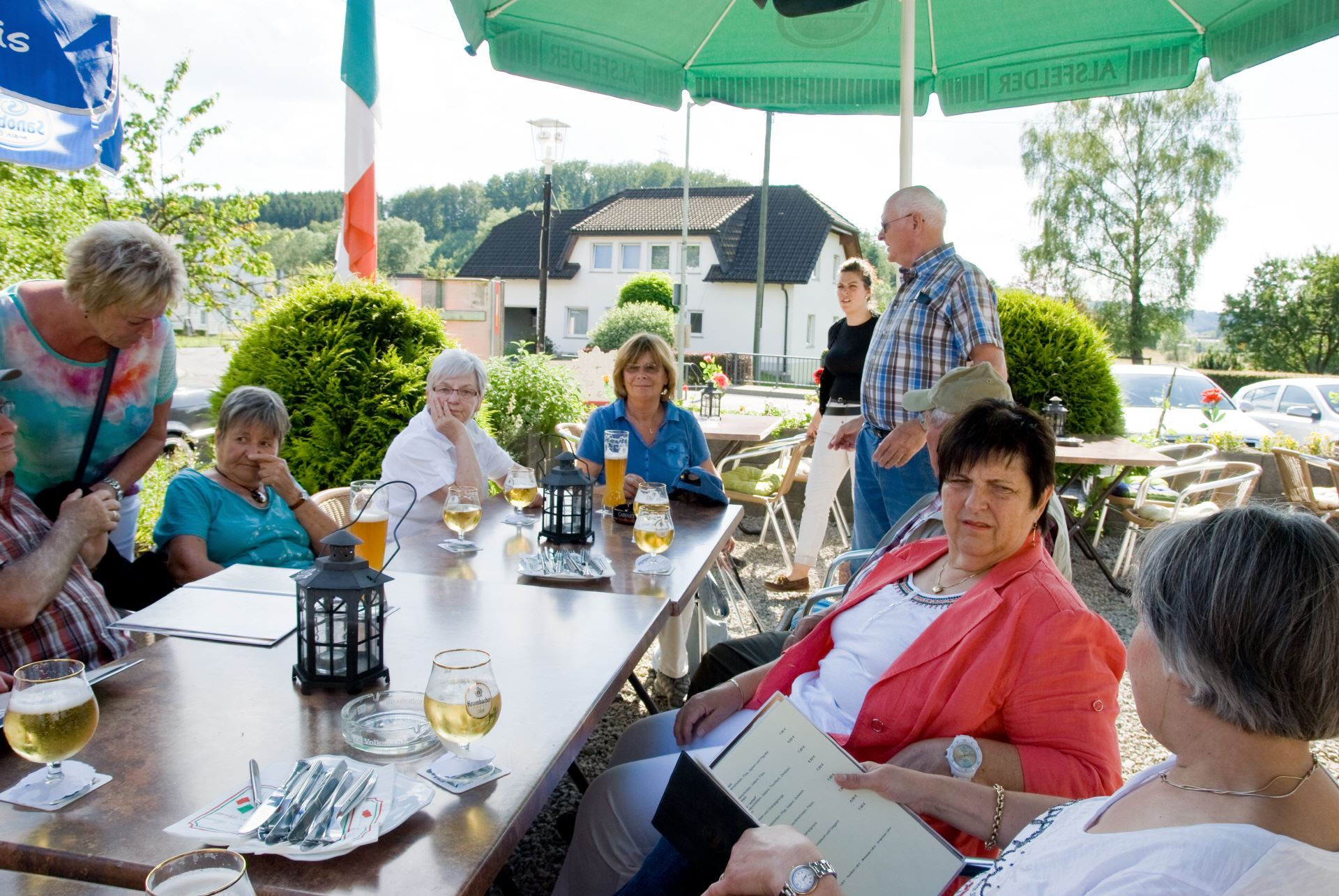 Bei herrlichem Wetter führte uns die kleine Wanderung nach Anzhausen. Mit gemächlichem Gang und einigen Pausen, sowie 2 angebotenen Wegstrecken erreichten wir nach 1 1/2 bzw. 2 Stunden unser Ziel - das "Gasthaus im Weißtal". Inhaber Angelo Leo hatte uns im Biergarten einen schönen Platz reserviert. Als Hunger und Durst gestillt waren, machten wir uns auf, um auf dem kürzesten Weg wieder nach Flammersbach zu wandern.