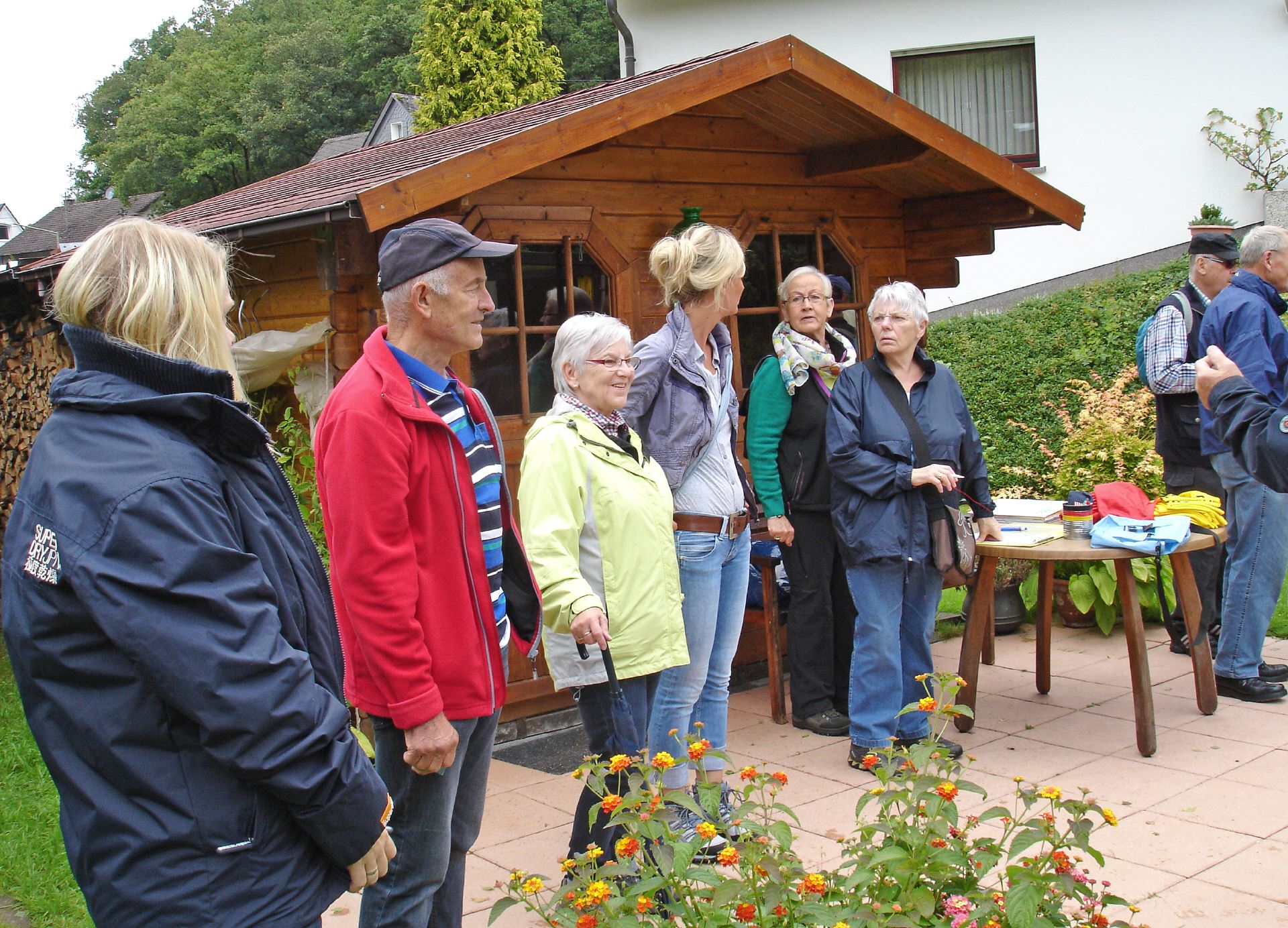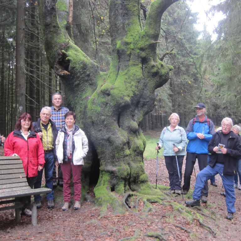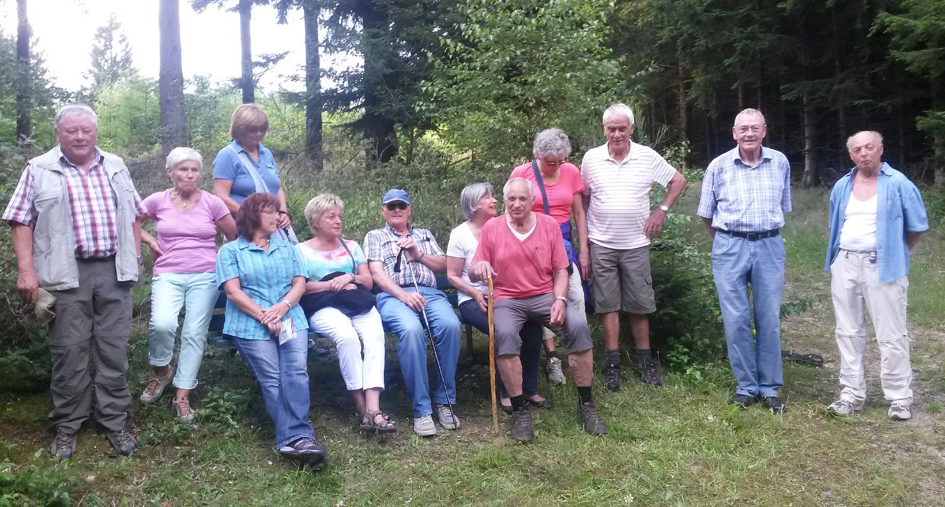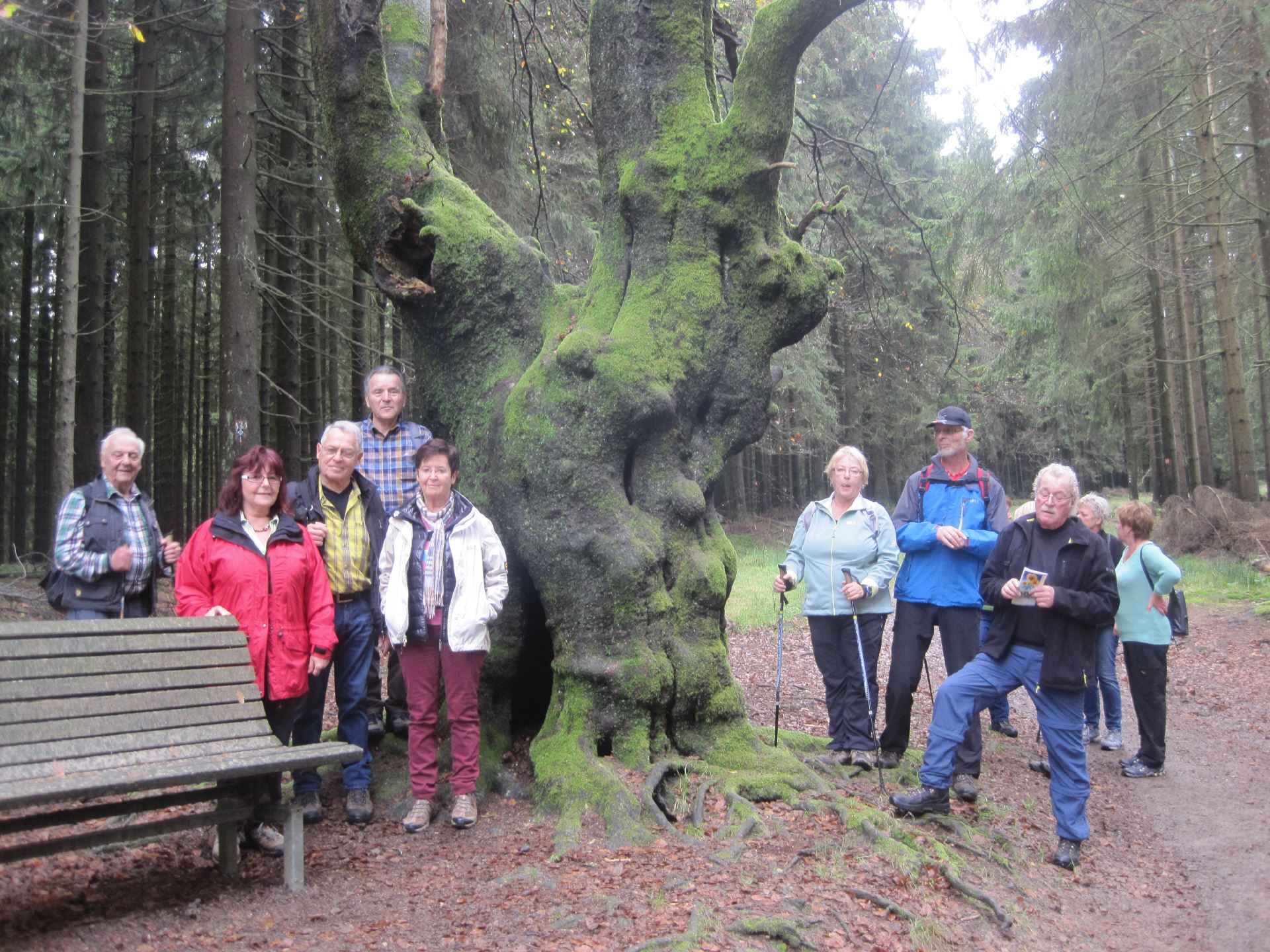 Ausgangspunkt und Ankunft der Rundwanderung war der Parkplatz am Schützenhaus Hubertusheim Irmgarteichen mit der Wanderführerin Regina. Teilweise läuft der Sonnenweg parallel zum Dilldappenweg und über den Rothaarsteig. Einen ersten Infobericht gab es vor Ort an der Kapelle in Hainchen. Das Geläut wurde 1953 erneuert und das alte Glöckchen wurde dem Kloster Eremitage hinterlassen. Der Wanderweg führte uns durch Hainchen zu der Wasserburg. Sie ist die einzige Höhenwasserburg Westfalens, welche bereits im Jahre 1290 urkundlich erwähnt wurde. Beeindruckend war am Wanderweg die alte Zwillingsbuche, die schon mehrere 100 Jahre alt ist. Die erste Rast mit 13 Wanderern war auf dem Rastplatz der Haincher Höhe. Leider war die Sicht durch die hochgewachsenen Sträucher versperrt.