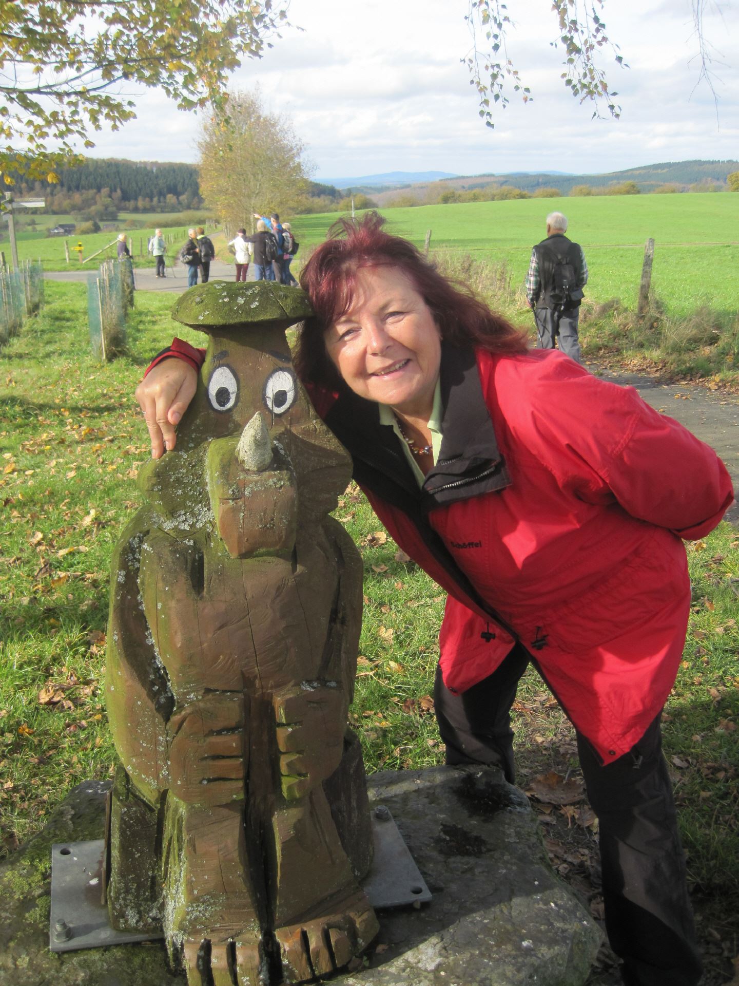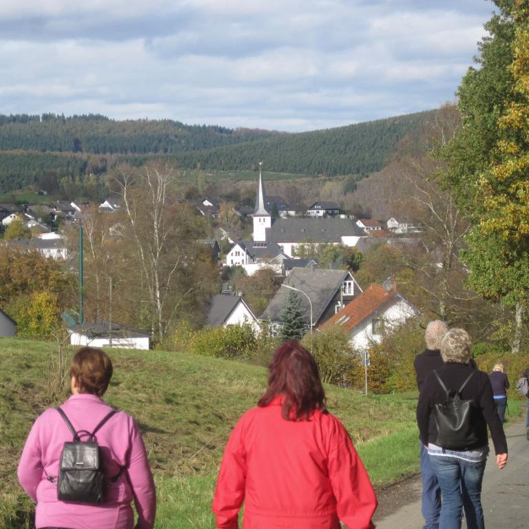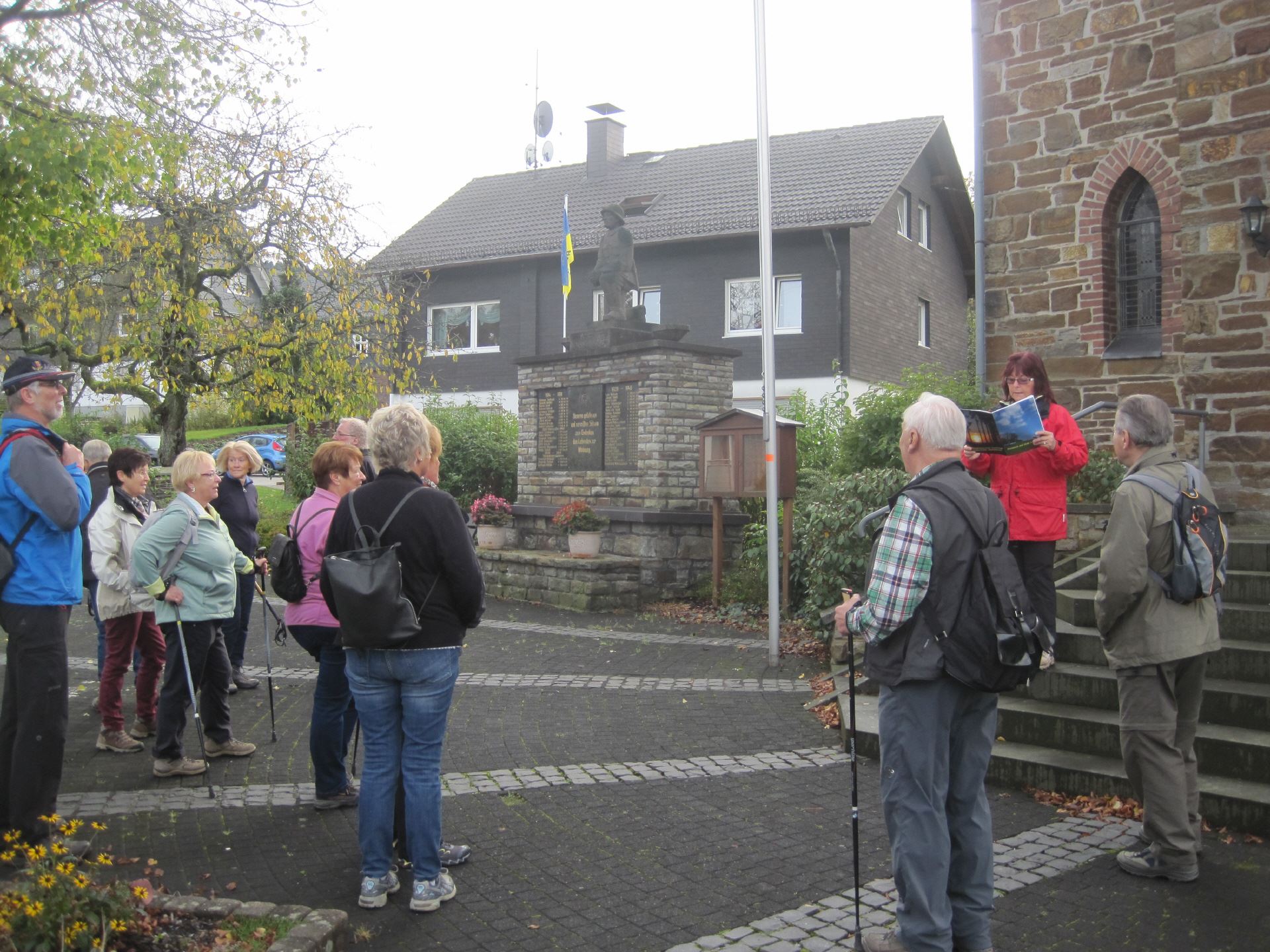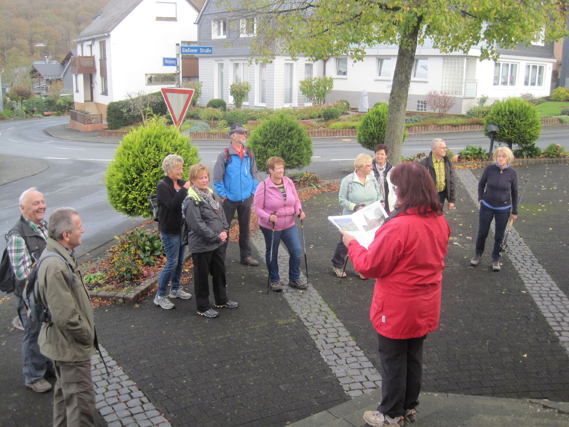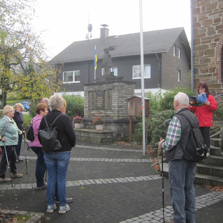 Ausgangspunkt und Ankunft der Rundwanderung war der Parkplatz am Schützenhaus Hubertusheim Irmgarteichen mit der Wanderführerin Regina. Teilweise läuft der Sonnenweg parallel zum Dilldappenweg und über den Rothaarsteig. Einen ersten Infobericht gab es vor Ort an der Kapelle in Hainchen. Das Geläut wurde 1953 erneuert und das alte Glöckchen wurde dem Kloster Eremitage hinterlassen. Der Wanderweg führte uns durch Hainchen zu der Wasserburg. Sie ist die einzige Höhenwasserburg Westfalens, welche bereits im Jahre 1290 urkundlich erwähnt wurde. Beeindruckend war am Wanderweg die alte Zwillingsbuche, die schon mehrere 100 Jahre alt ist. Die erste Rast mit 13 Wanderern war auf dem Rastplatz der Haincher Höhe. Leider war die Sicht durch die hochgewachsenen Sträucher versperrt.