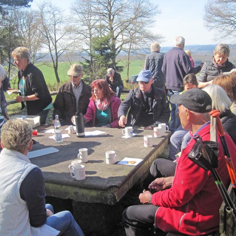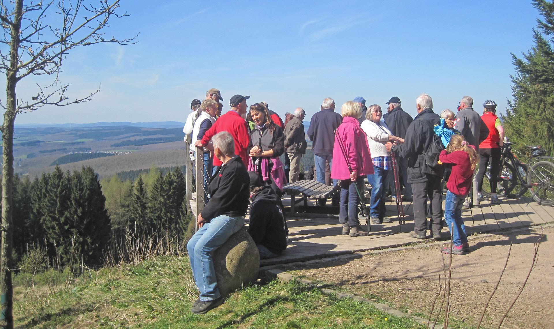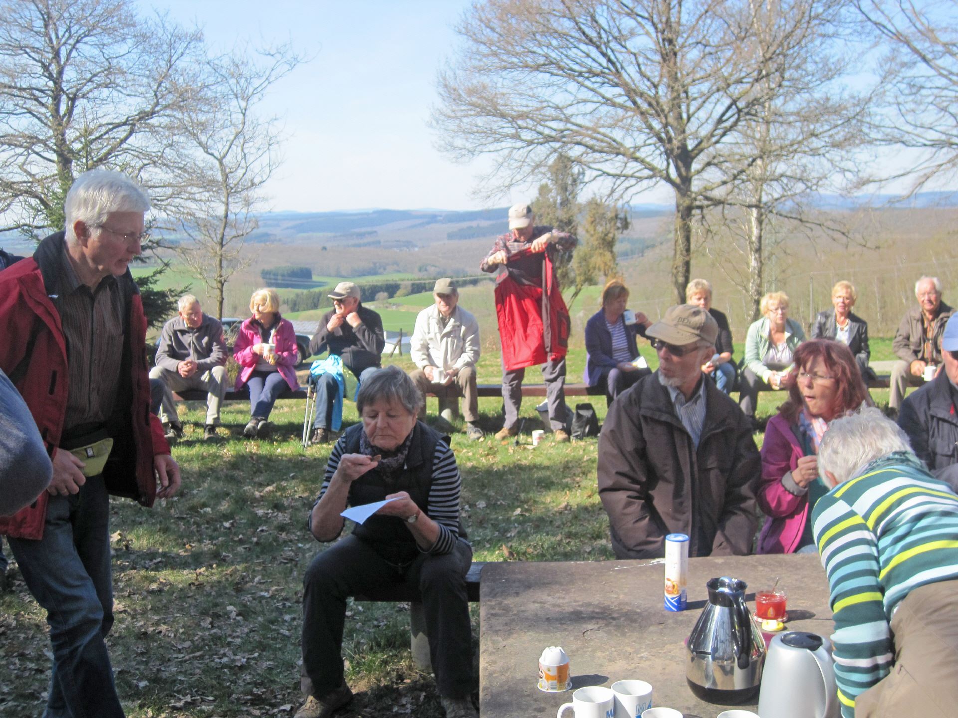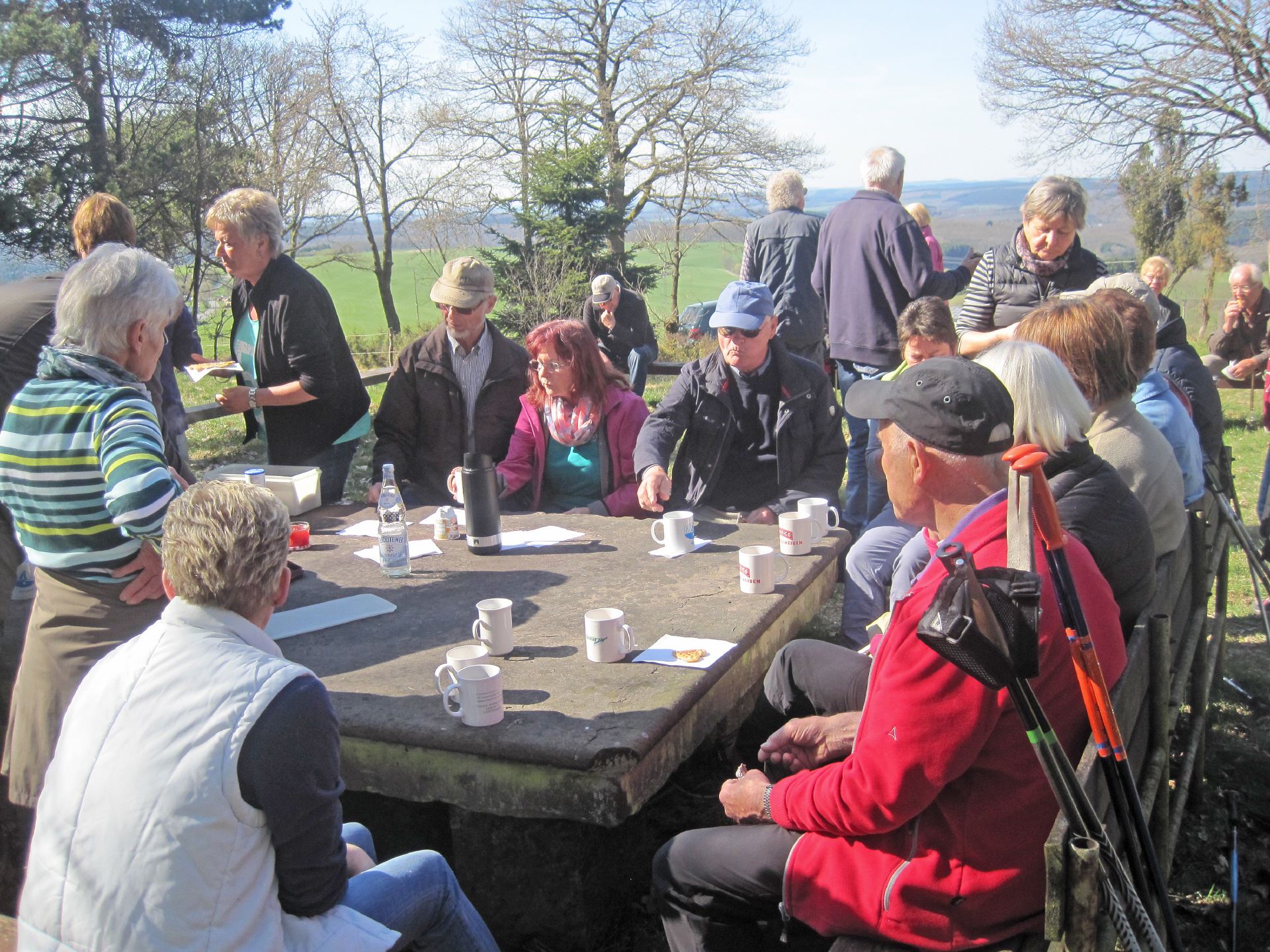 Bei sonnigem Wetter hatte Wanderführer Helmut Kölsch zur Wanderung ab der Wachholderheide-Wilgersdorf und über die Tiefenrother Höhe geladen. Dieser Einladung folgten 38 Wanderinnen und Wanderer plus Hund Yala. Die 7 Km Wanderstrecke führte vorbei an den Probebohrungen für die erweiterte Tunnellösung der DB im Rudersdorfer Tunel, durch Mischwald, über die Höhen mit Weitblick nach Rudersdorf, Rödgen und den Turm der Eisernhardt mit 134 meter Höhe, vorbei an dem bereits eingeebneten Platz für ein geplantes Windrad. Am Ziel der Rundwanderung, die Ruhebänke der Wachholderheide, gab es Kaffee, Waffeln und selbst gebackenen Kuchen von Marliese Kölsch.