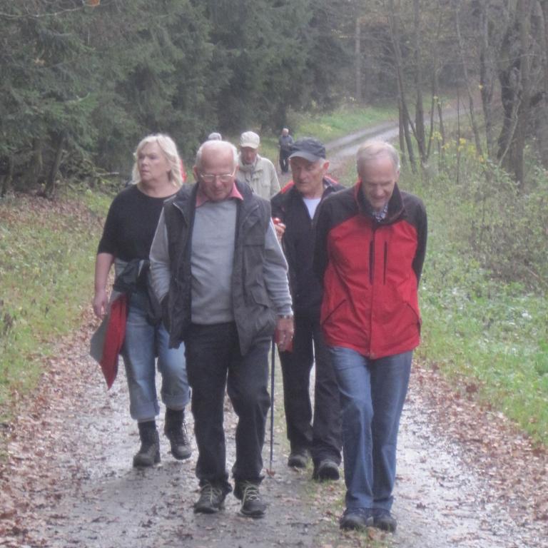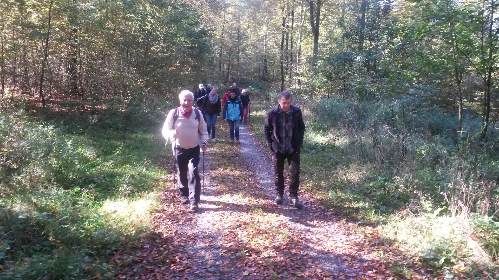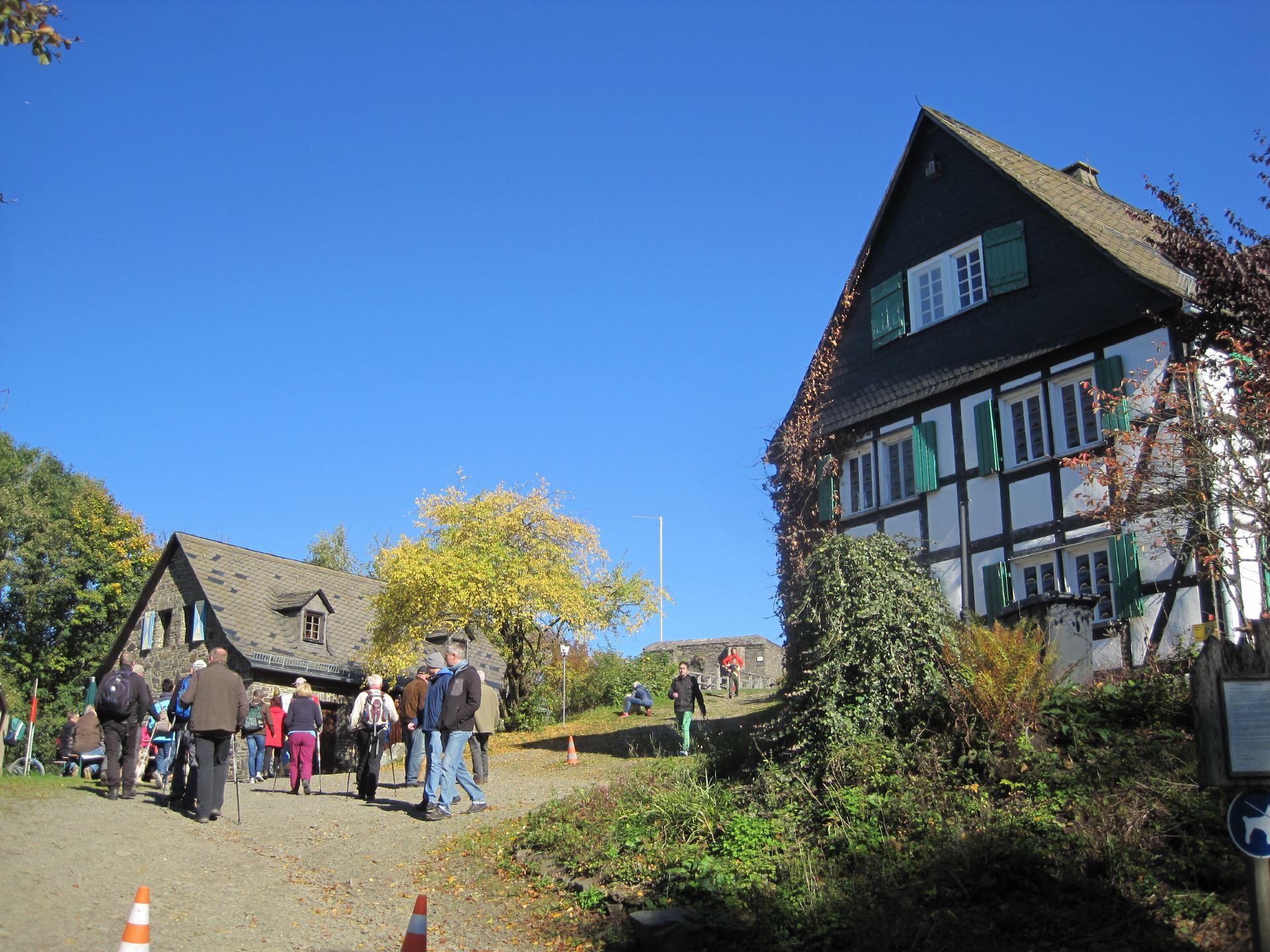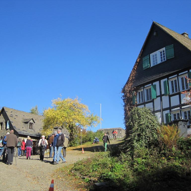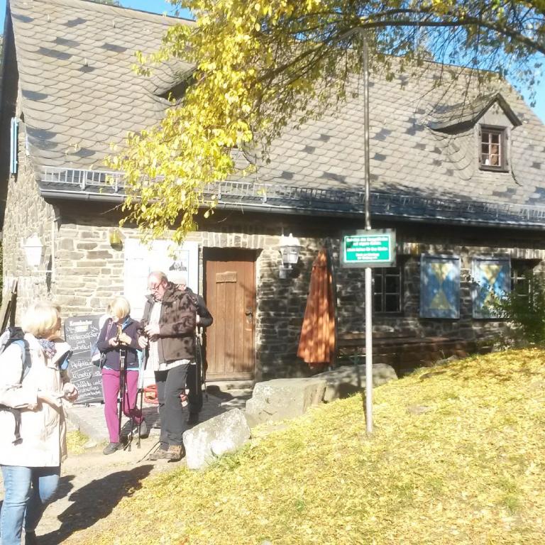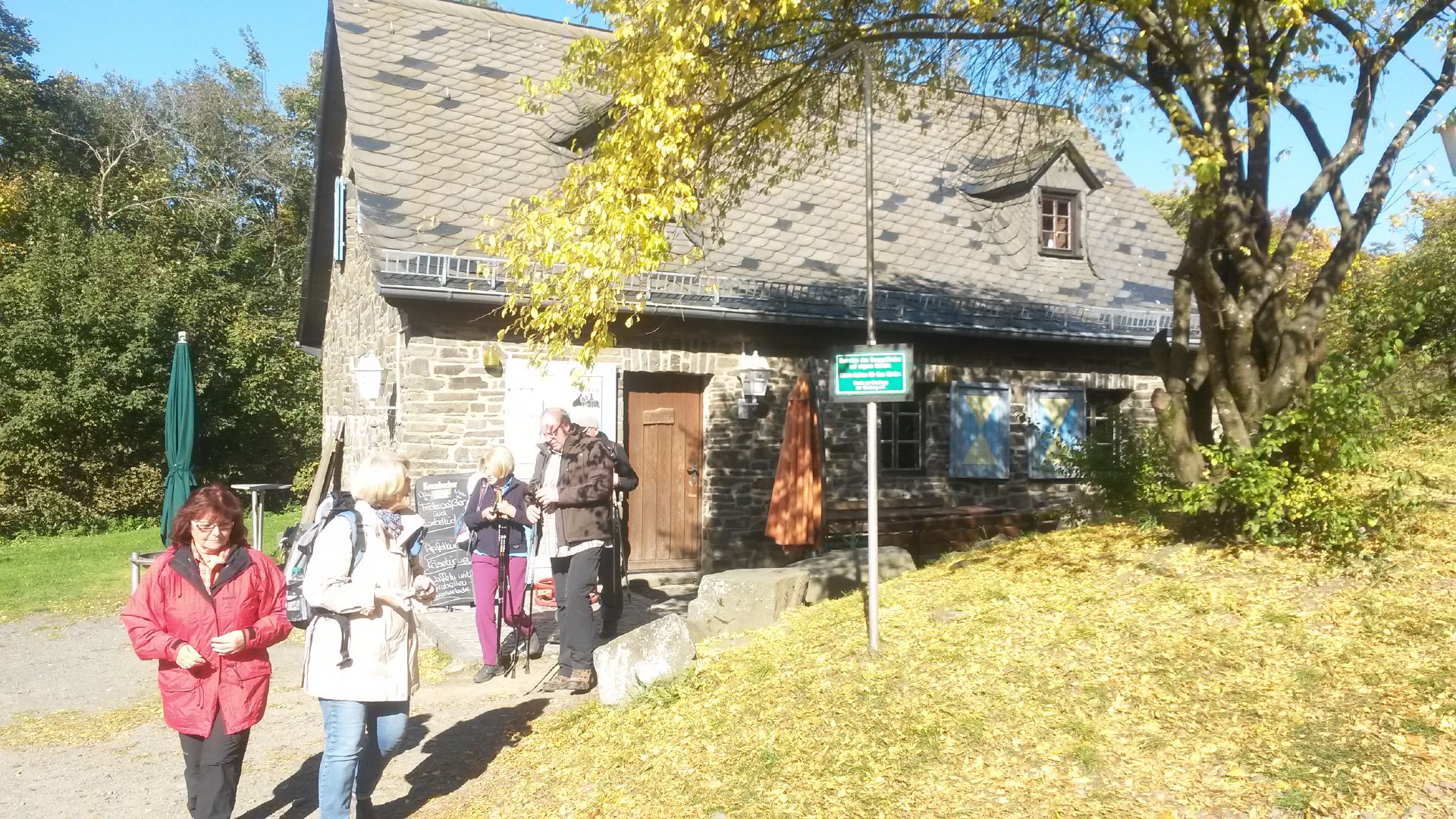 Am 11. Oktober erwanderten 13 Personen den wunderschönen Jung-Stilling-Weg. Gestartet sind wir am Dorfgemeinschaftshaus (alte Kapellenschule) in Grund. Von hier gingen wir auf der Jung-Stilling-Straße durch den idyllischen Dorfkern an Jung-Stillings Geburtshaus einschließlich der Gedenkstube vorbei den Berg hinauf zum Weidekampen am "Hitzigen Stein" (562 ü NN) und weiter Richtung Kronprinzeneiche.Hier haben wir eine kleine Rast gemacht. Nach dem überqueren der Straße wanderten wir weiter auf einem Stück mittelalterlicher Handelsstraße, einem urigen Pfad, weiter zur Ginsburg (583 m ü NN). Hier bietet der restaurierte Aussichtsturm eine wundervolle Aussicht auf Hilchenbach. In der Kaffeestube der Burgküche machten wir eine kleine Rast bei Kaffee und Kuchen. Von der Ginsburg aus ging es dann wieder bergab am Bahnhof Zollposten vorbei, am Kromberg entlang bis in das liebliche Insbachtal. Auf dieser Strecke hatten wir noch einmal eine wunderschöne Aussicht auf das Dorf Grund, bevor wir langsam hinunter stiegen. Unten im Tal wartete ein Kneipp-Wassertretbecken auf uns, in dem keiner die Füße Abkühlen wollte. Von hier aus ging es wieder zum Ausgangspunkt nach Grund. Bei schönstem Oktoberwetter mit Sonnenschein zeigte die Natur sich in Herbstlicher Farbenpracht. Erfreulich war auch das zwei neue Wanderfreunde uns begleiteten.