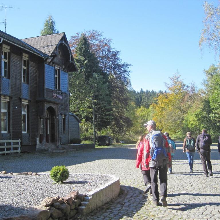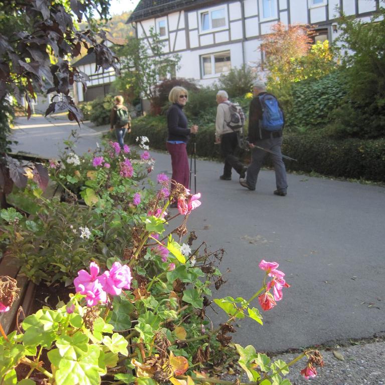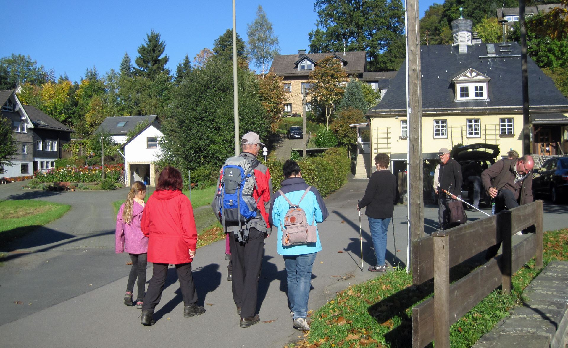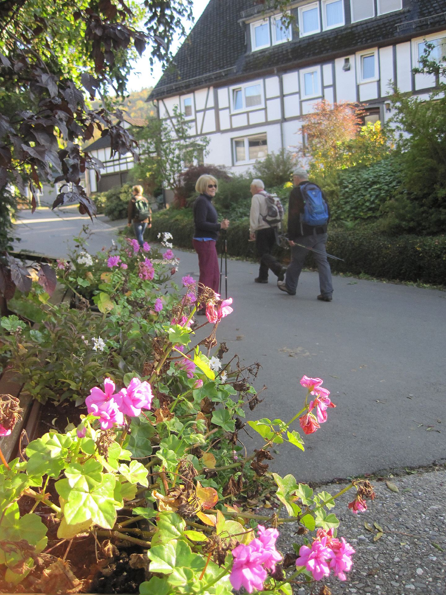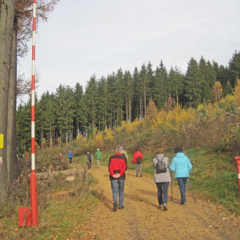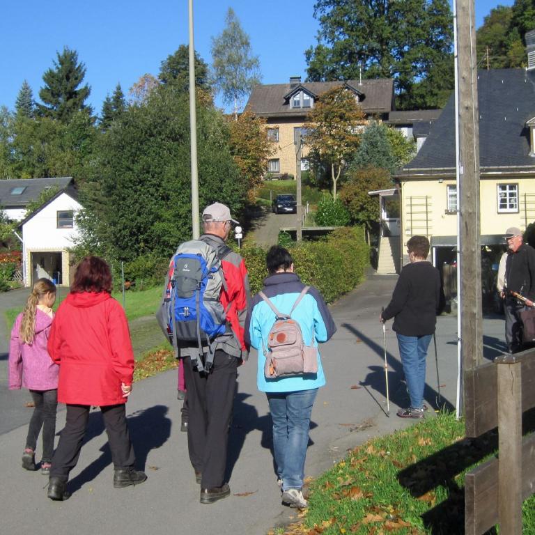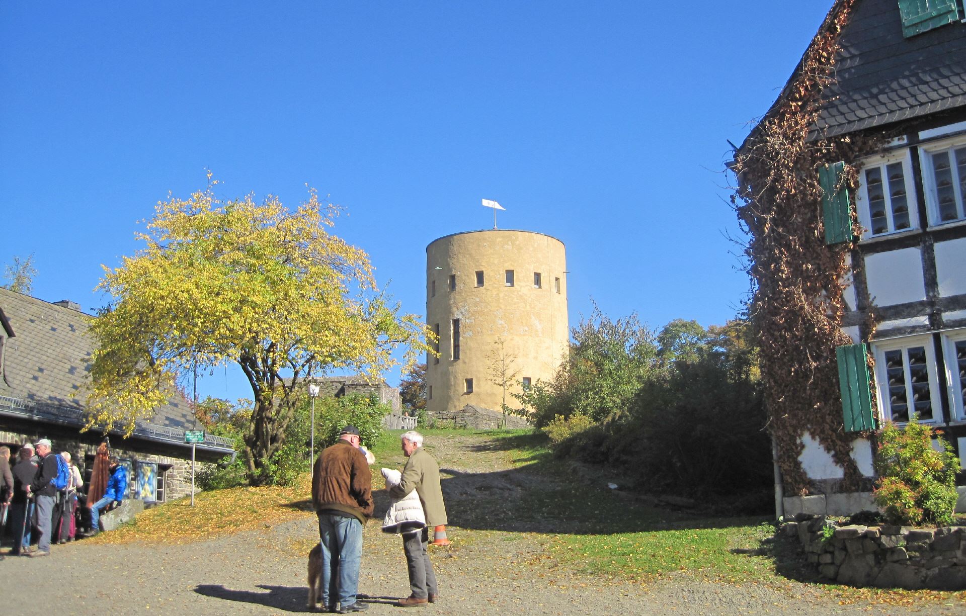 Am 11. Oktober erwanderten 13 Personen den wunderschönen Jung-Stilling-Weg. Gestartet sind wir am Dorfgemeinschaftshaus (alte Kapellenschule) in Grund. Von hier gingen wir auf der Jung-Stilling-Straße durch den idyllischen Dorfkern an Jung-Stillings Geburtshaus einschließlich der Gedenkstube vorbei den Berg hinauf zum Weidekampen am "Hitzigen Stein" (562 ü NN) und weiter Richtung Kronprinzeneiche.Hier haben wir eine kleine Rast gemacht. Nach dem überqueren der Straße wanderten wir weiter auf einem Stück mittelalterlicher Handelsstraße, einem urigen Pfad, weiter zur Ginsburg (583 m ü NN). Hier bietet der restaurierte Aussichtsturm eine wundervolle Aussicht auf Hilchenbach. In der Kaffeestube der Burgküche machten wir eine kleine Rast bei Kaffee und Kuchen. Von der Ginsburg aus ging es dann wieder bergab am Bahnhof Zollposten vorbei, am Kromberg entlang bis in das liebliche Insbachtal. Auf dieser Strecke hatten wir noch einmal eine wunderschöne Aussicht auf das Dorf Grund, bevor wir langsam hinunter stiegen. Unten im Tal wartete ein Kneipp-Wassertretbecken auf uns, in dem keiner die Füße Abkühlen wollte. Von hier aus ging es wieder zum Ausgangspunkt nach Grund. Bei schönstem Oktoberwetter mit Sonnenschein zeigte die Natur sich in Herbstlicher Farbenpracht. Erfreulich war auch das zwei neue Wanderfreunde uns begleiteten.