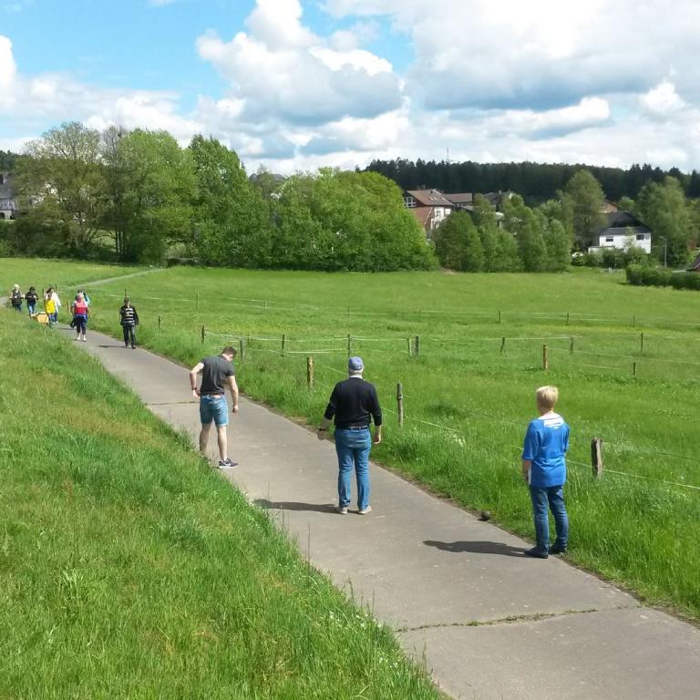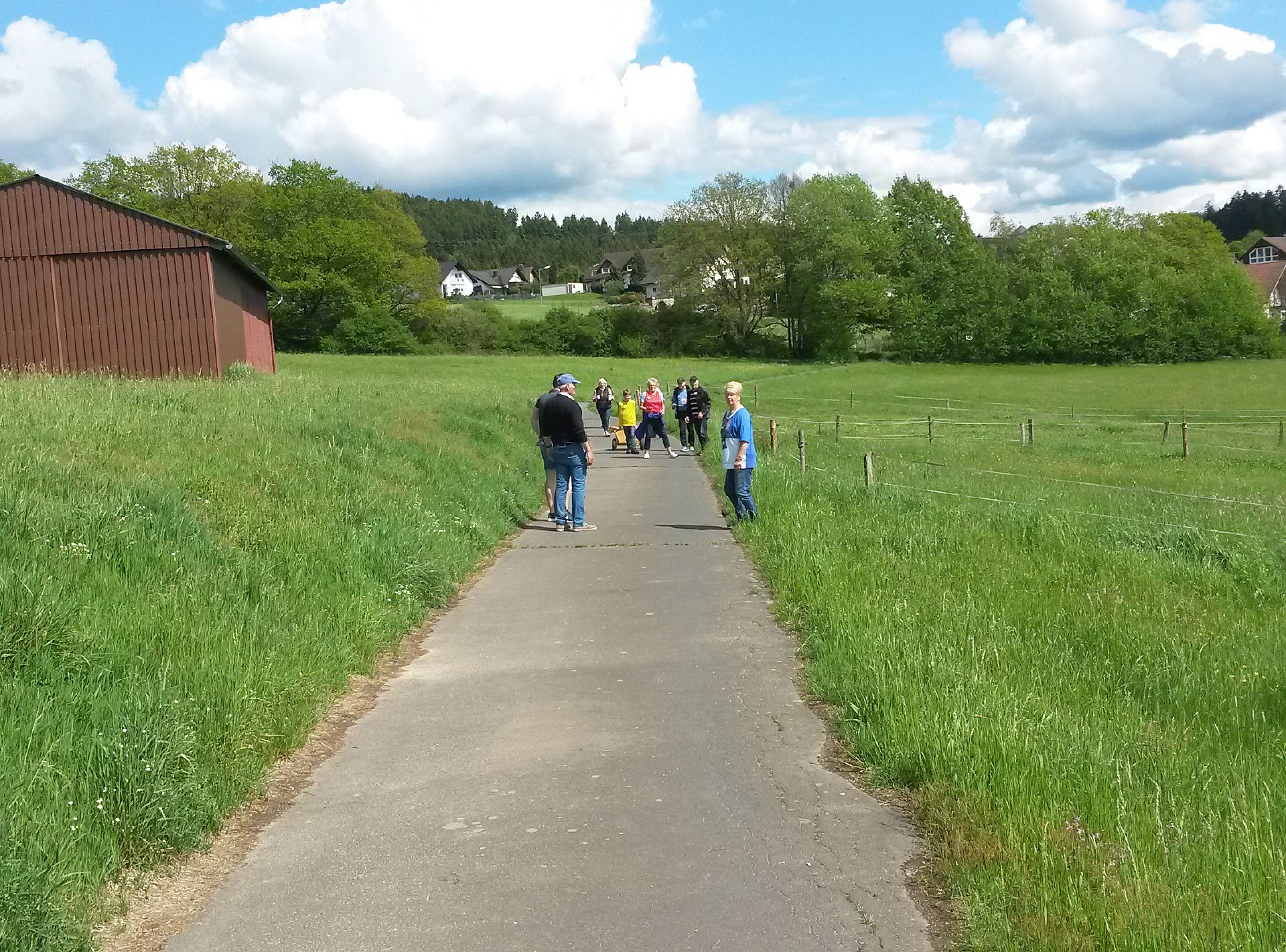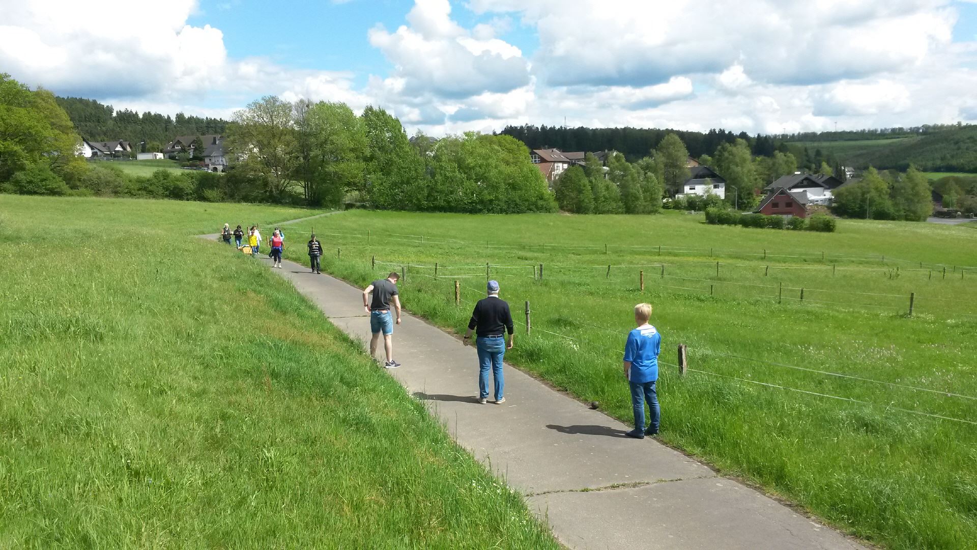 Am 20.Mai 2017 um 14:00 Uhr war es wieder soweit. 27 Personen trafen sich bei schönem Wetter in der Flammersbacher Straße bei den Kölsches. Dort wurden die Startnummern gezogen und die Mitstreiter in vier Gruppen aufgeteilt. Start - und Zielpunkt war der Ortsausgang Flammersbach in Richtung des Anzhäuser Wasserbehälters. Mit zwei Bollerwagen, auf denen die Getränke für den Weg transportiert wurden, ging es mit allen Gruppen an den Start. Als Wurfgeschosse benutzt man entweder eine Holzkugel auf dem Hinweg und eine Gummikugel auf dem Rückweg oder umgekehrt. Über jedem Wurf wurde akribisch Buch geführt, um am Ende die Gewinner zu ermitteln. Halbzeit war auf der Hangseite zum Weißtal. Dort gab es Kaffee und selbst gebackenen Kuchen zur Stärkung. Hier wurde dann natürlich auch die Kugel getauscht, um eine Gleichheit der Würfe zu erzielen.