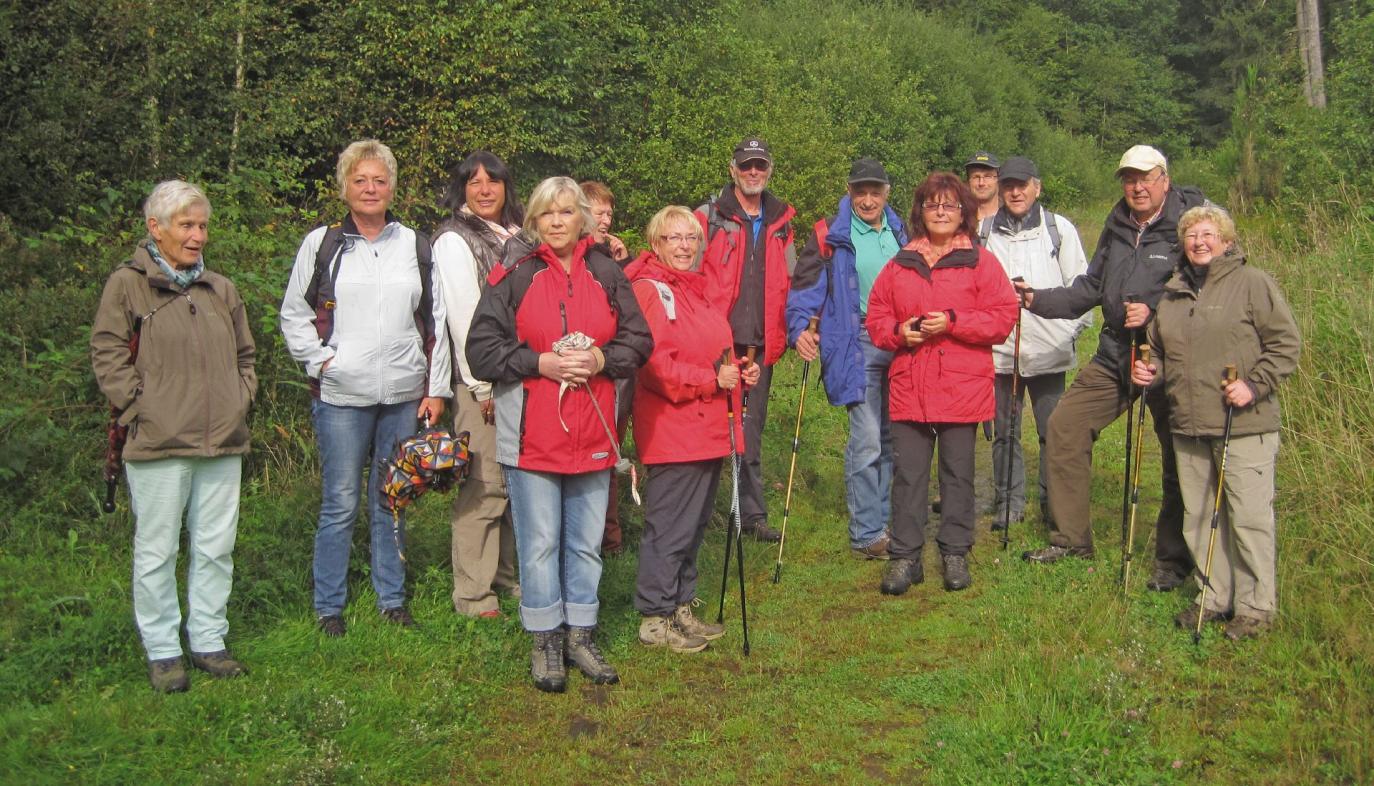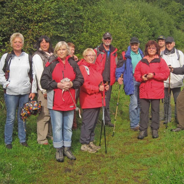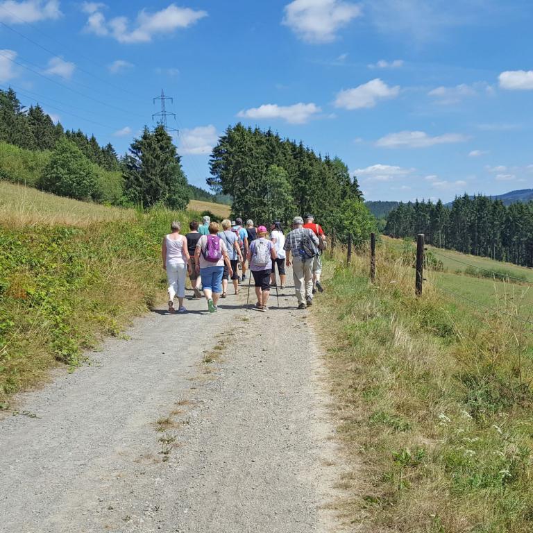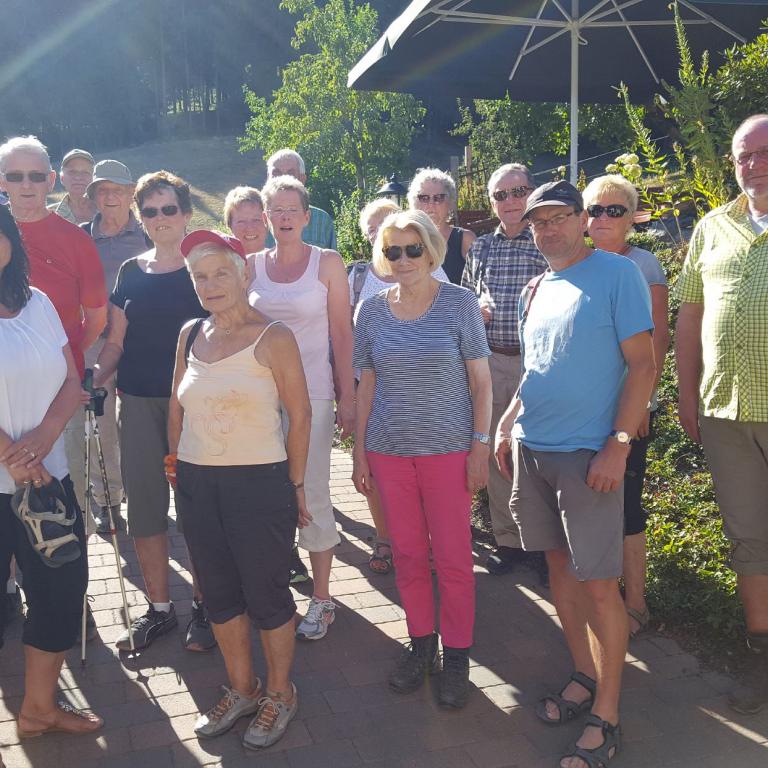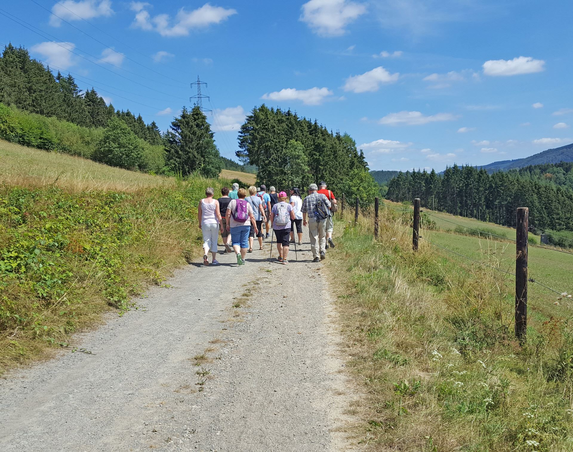 18 Wanderer fuhren ins Sauerland um dort zu wandern. Zunächst ging es bei der Rundstrecke steil bergauf. Nach einigen Anstrengungen waren wir auf der Höhe und hatten dann eine nicht mehr ansteigende Strecke, die gut zu laufen war. Es ging dem Kirchbach entlang ins Tal, ein sehr schöner Weg. Dann ging es Richtung Hofcafe und kamen an einer schönen, kleinen Kirche in Kickenbach vorbei, die wir besichtigten. Danach erreichten wir das Hofcafe und ließen bei Kaffee und gutem Kuchen die Wanderung ausklingen.