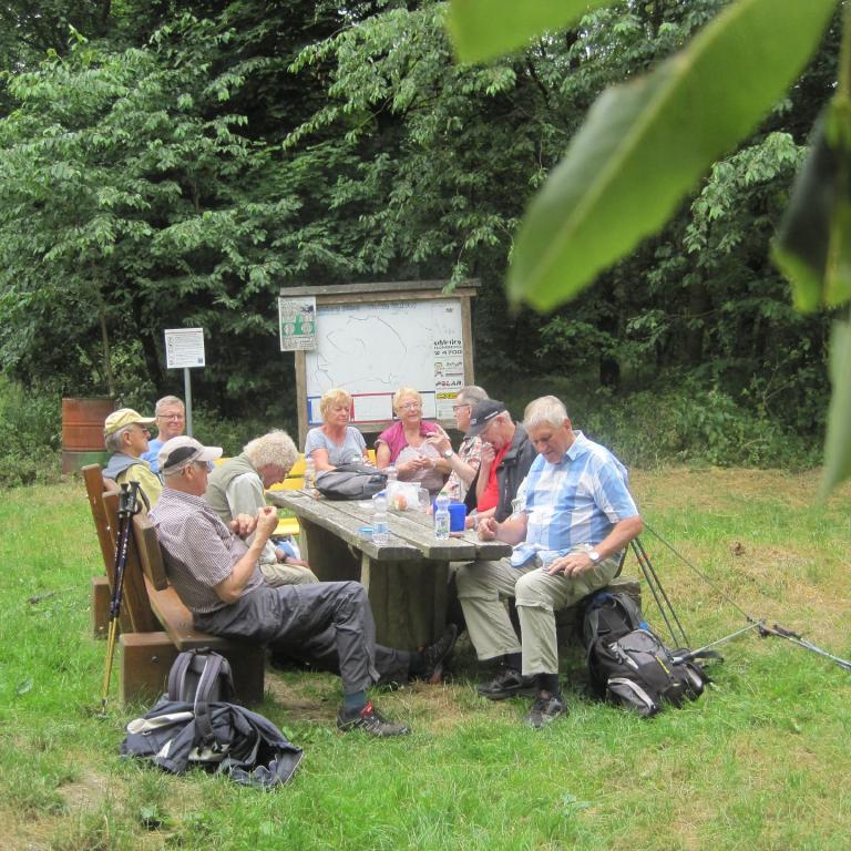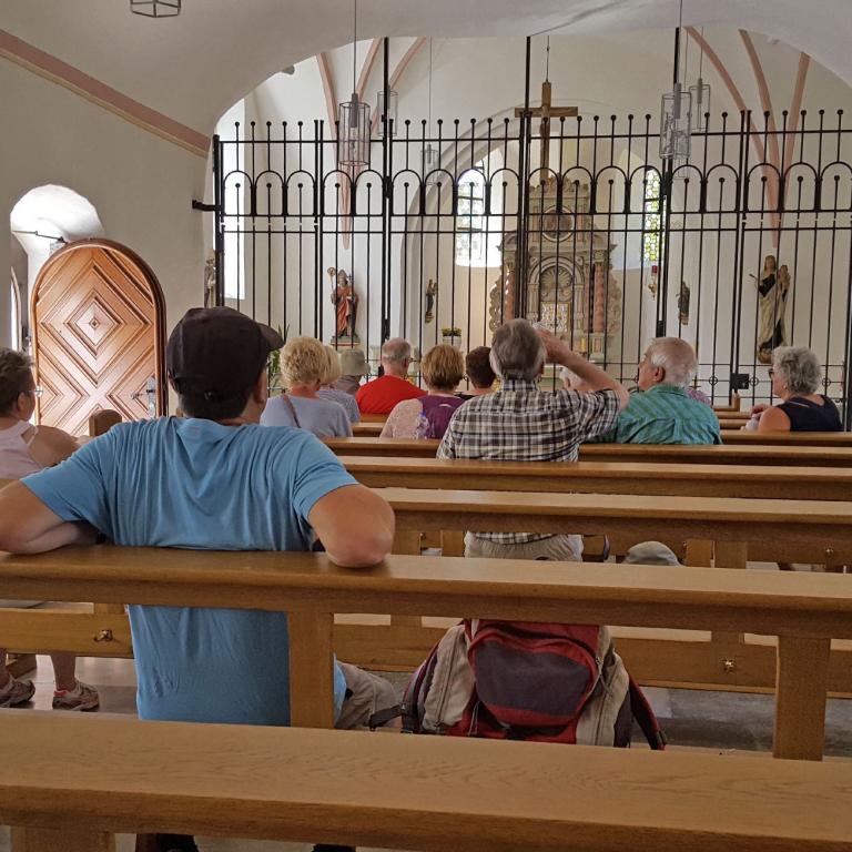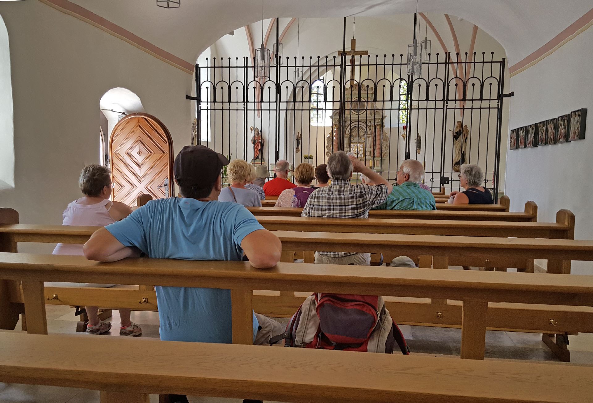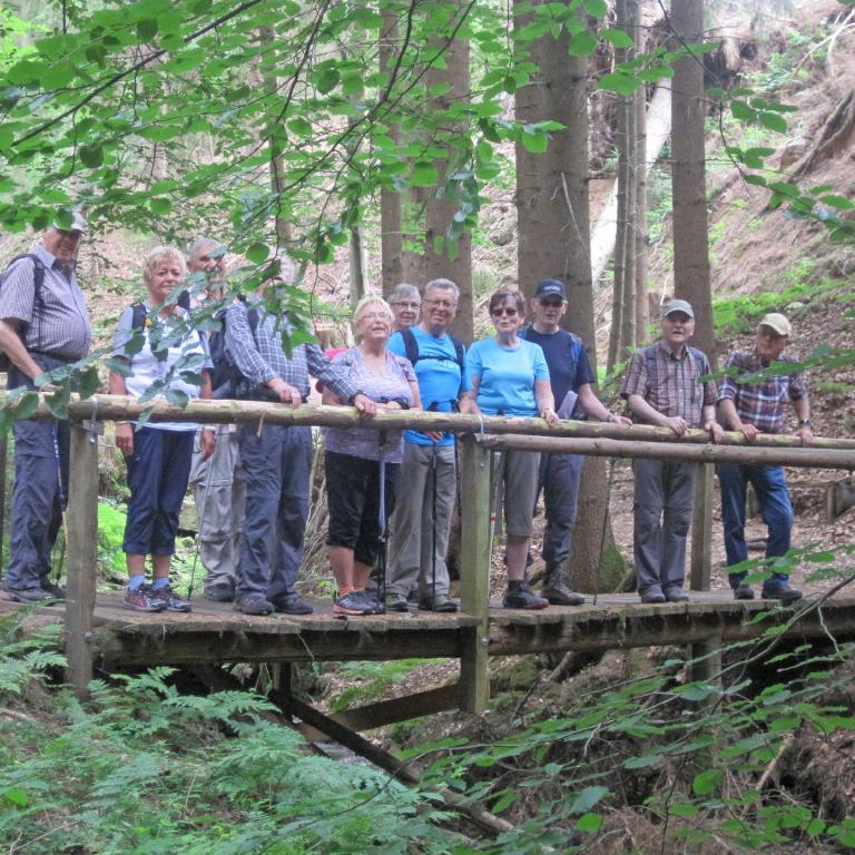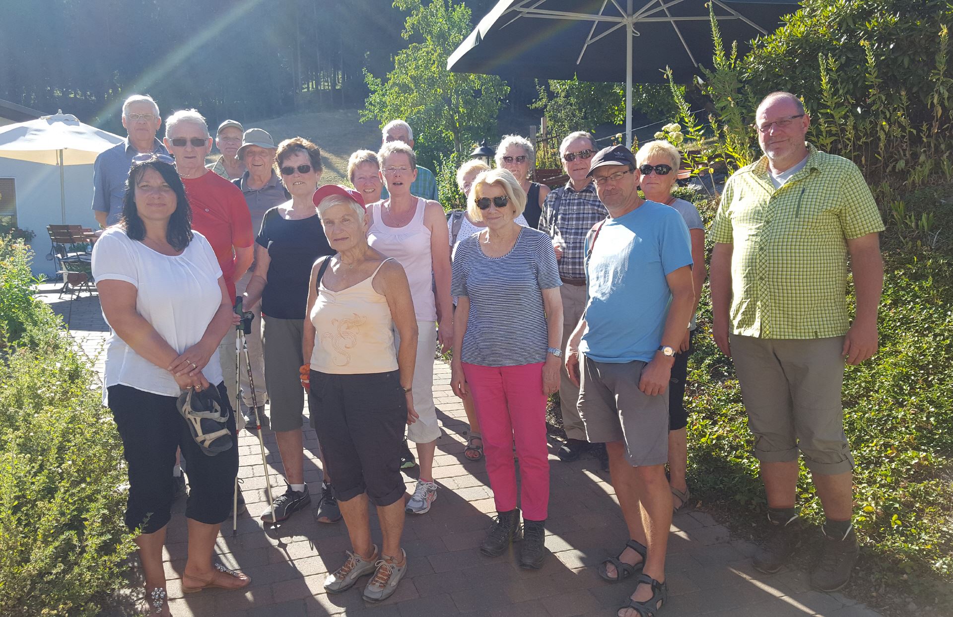 18 Wanderer fuhren ins Sauerland um dort zu wandern. Zunächst ging es bei der Rundstrecke steil bergauf. Nach einigen Anstrengungen waren wir auf der Höhe und hatten dann eine nicht mehr ansteigende Strecke, die gut zu laufen war. Es ging dem Kirchbach entlang ins Tal, ein sehr schöner Weg. Dann ging es Richtung Hofcafe und kamen an einer schönen, kleinen Kirche in Kickenbach vorbei, die wir besichtigten. Danach erreichten wir das Hofcafe und ließen bei Kaffee und gutem Kuchen die Wanderung ausklingen.