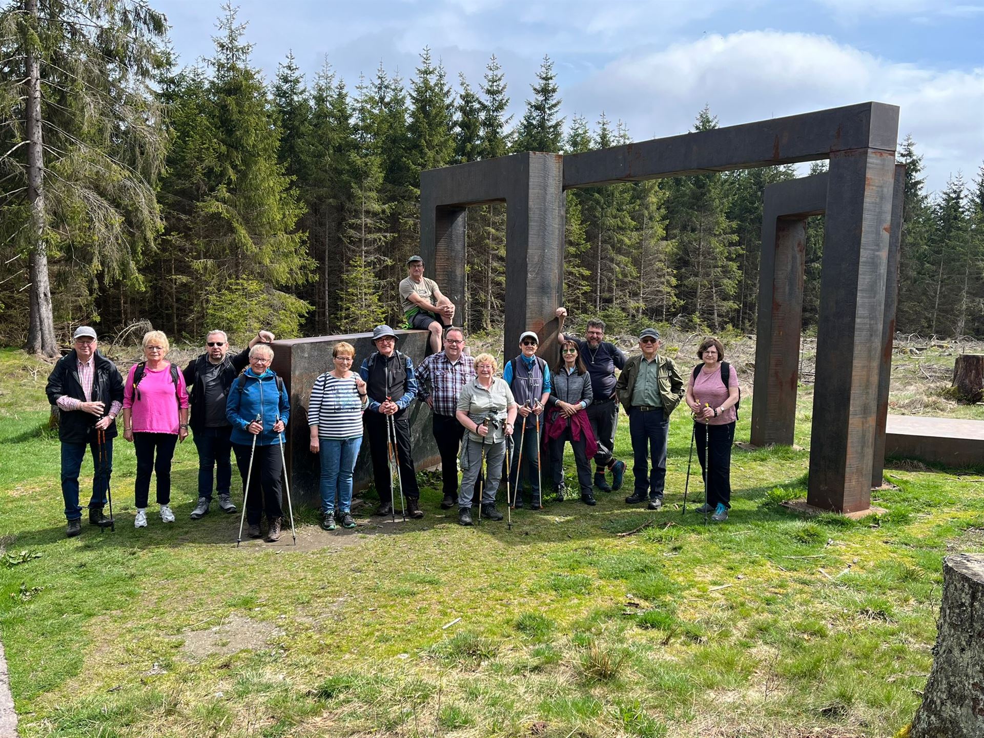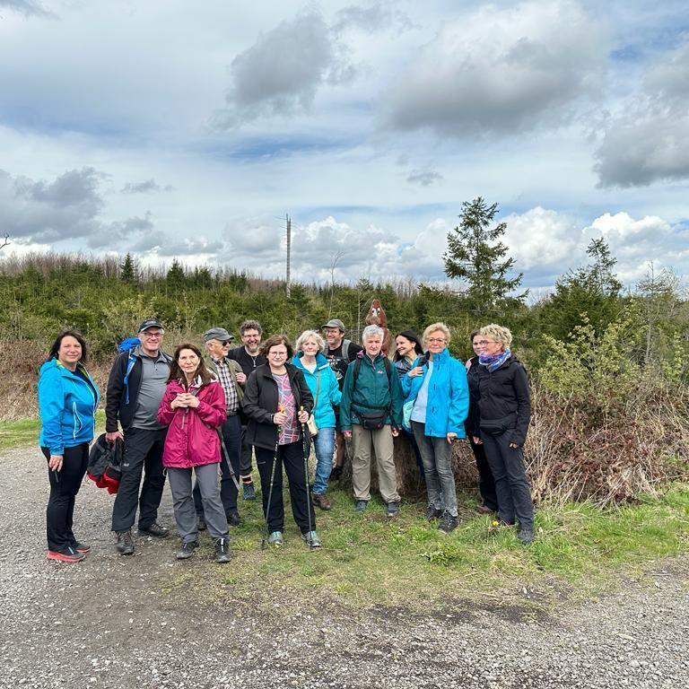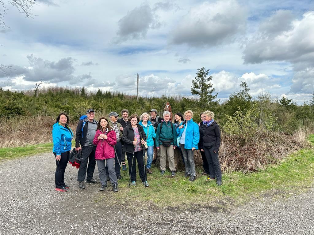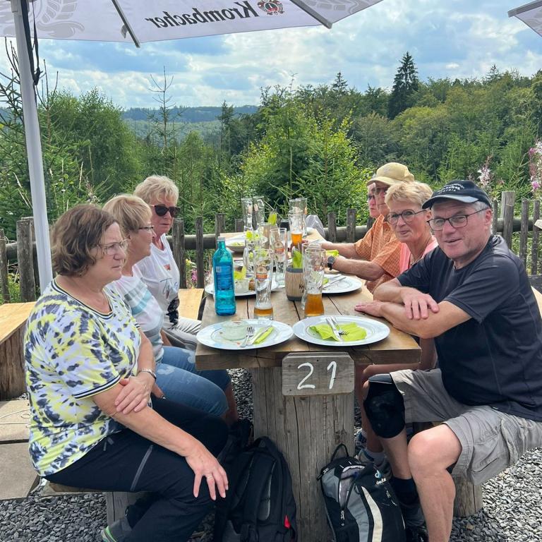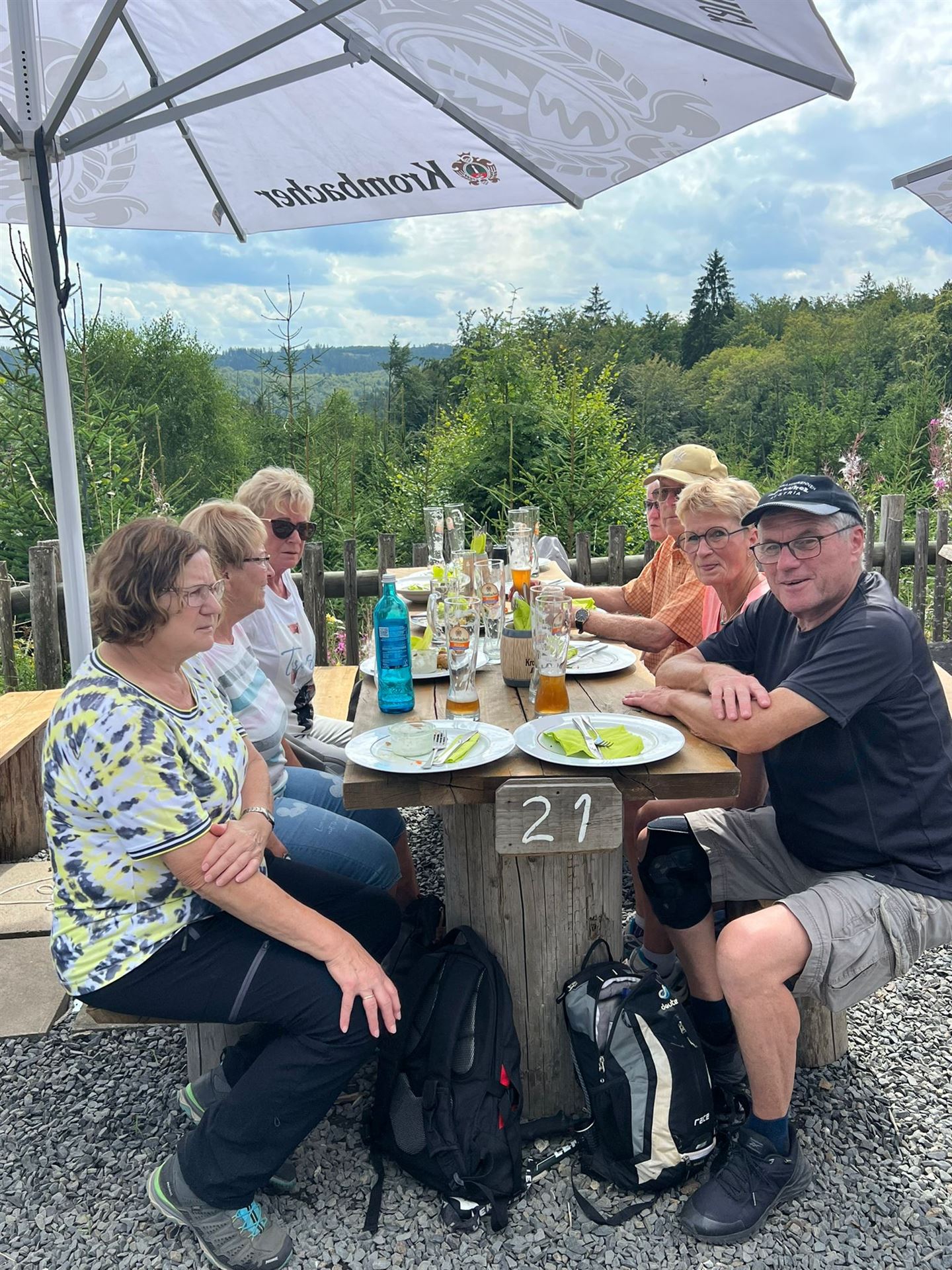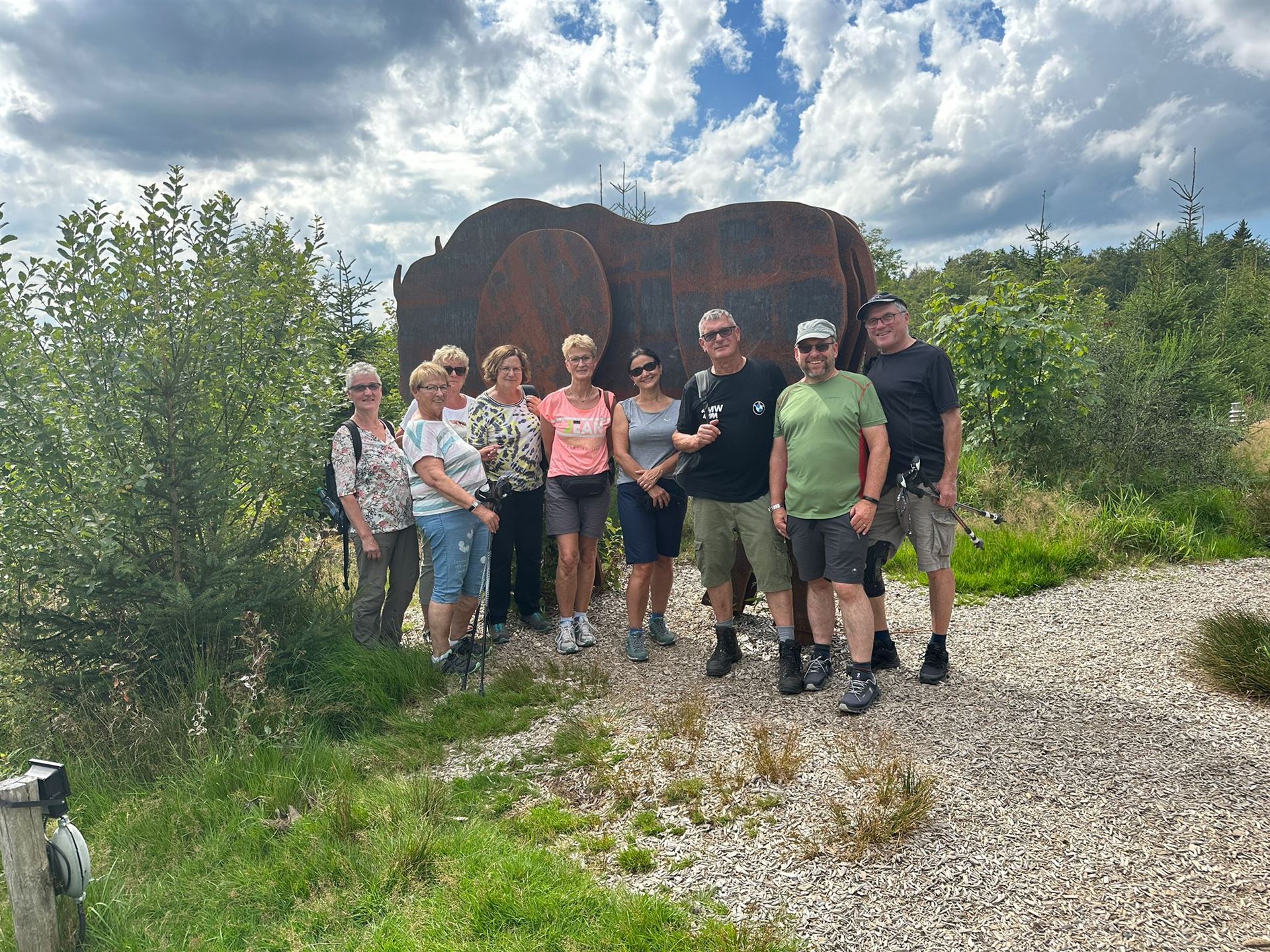 Am Sonntag fuhren 15 Personen von Flammersbach zum Wanderparkplatz Kühhude bei Berleburg. Von dort führte ein schöner Wanderweg, ca. 3km und wenig Steigung, vorbei an einigen Skulpturen, zur Almhütte Schanze. Hier wurden wir sehr freundlich begrüßt und konnten uns aus der rustikalen Speisekarte, leckere Gerichte bestellen und genießen. Nach ca. zwei Stunden ging es mit einem kleines Schlenker über den Kyrillpfad zurück zum Wanderparkplatz.