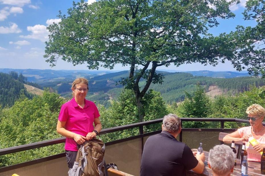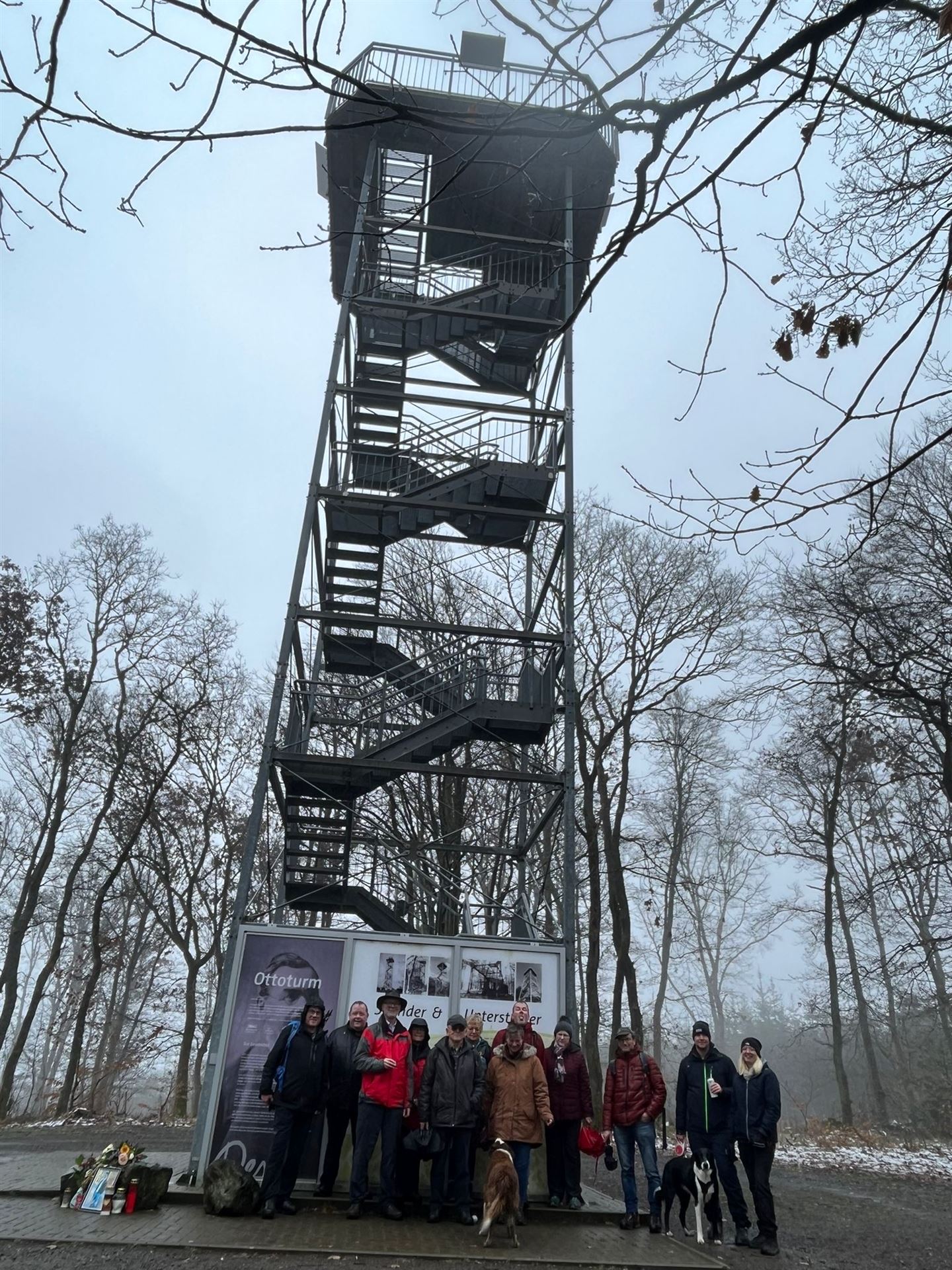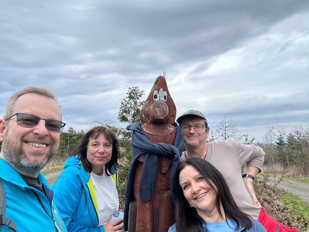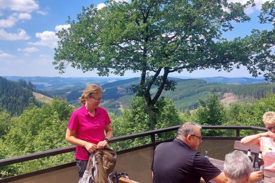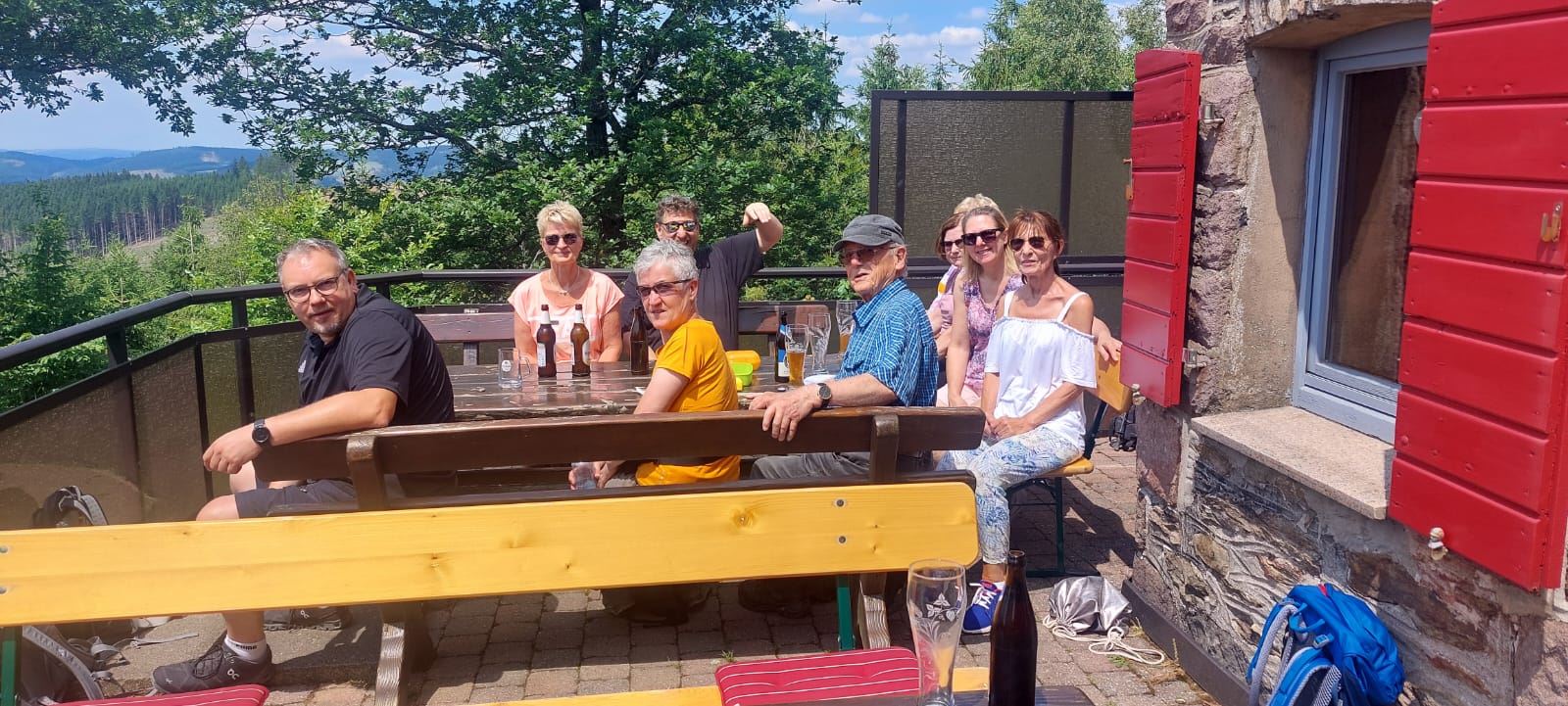14 Wanderer und 1 Biker wurden sonntags Am Steimel kulinarisch verwöhnt und das noch zu passablen Preisen! Vorher wurde der Pfannenbergturm umwandert, teilweise auch bestiegen, anschließend ging es weiter über den Römel zur Kreuzung der ehemaligen 130 Jahre alten Kreuzeiche, die umgefahren wurde und anschließend dem Sturm in 2019 zum Opfer fiel.