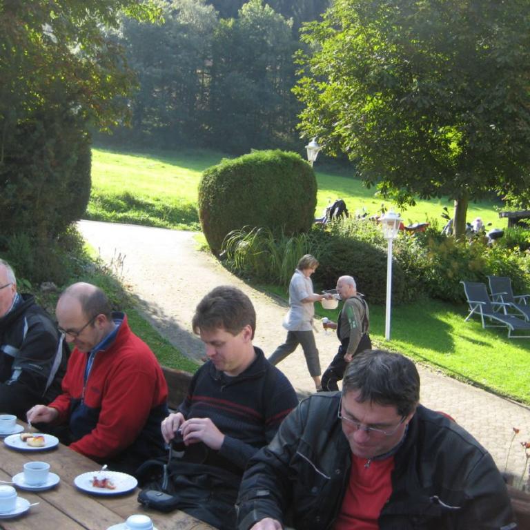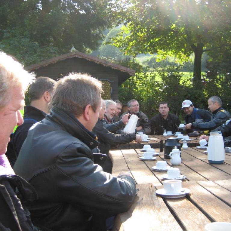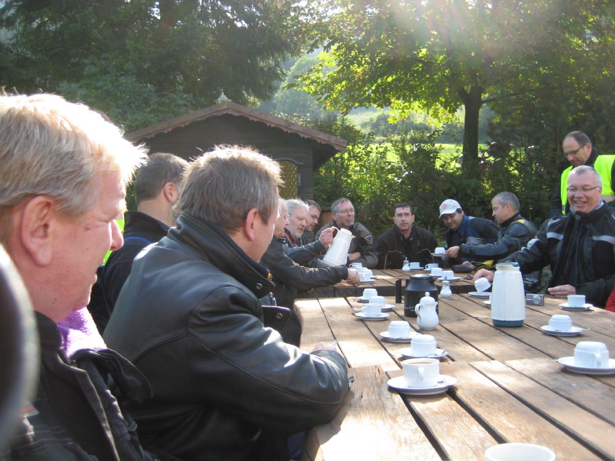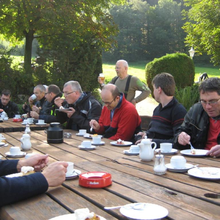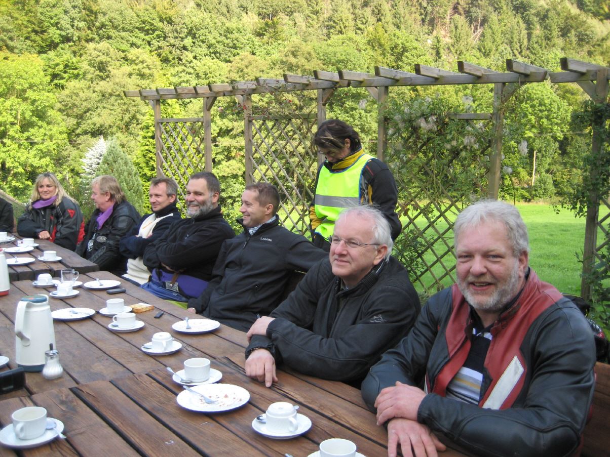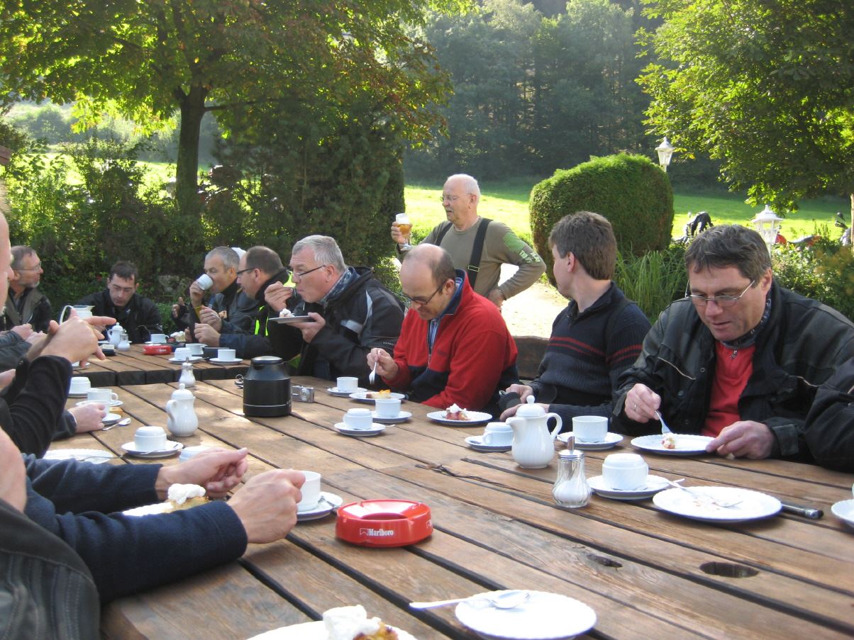 Glücklicherweise verzogen sich dann die Regenwolken und bei blauem Himmel und Sonnenschein startete die 2. Etappe über Rönkhausen/Allendorf... . Nachmittags dann ein weiterer Halt bei dem idyllisch gelegenen Jagdhof Nöcker. in Linneperhütte. Dort wartete auf die Biker schon eine große Kaffeetafel mit hausgemachtem Kuchen.
