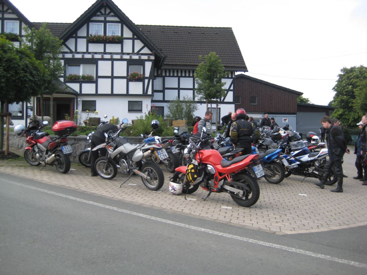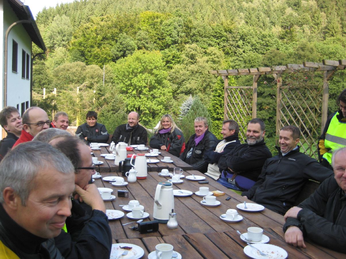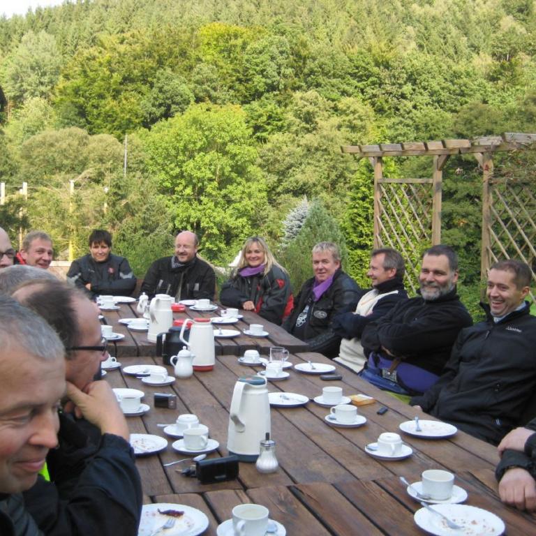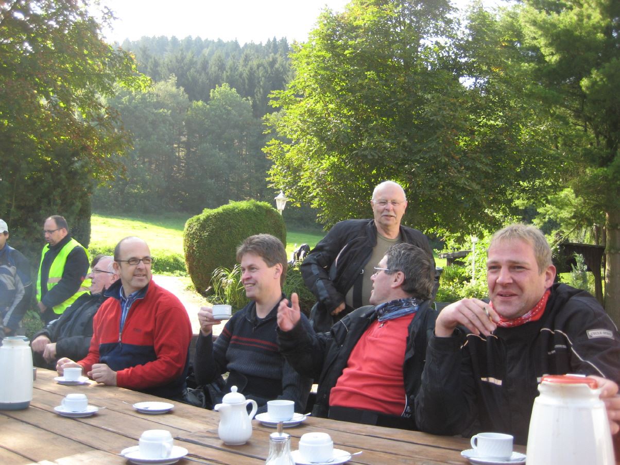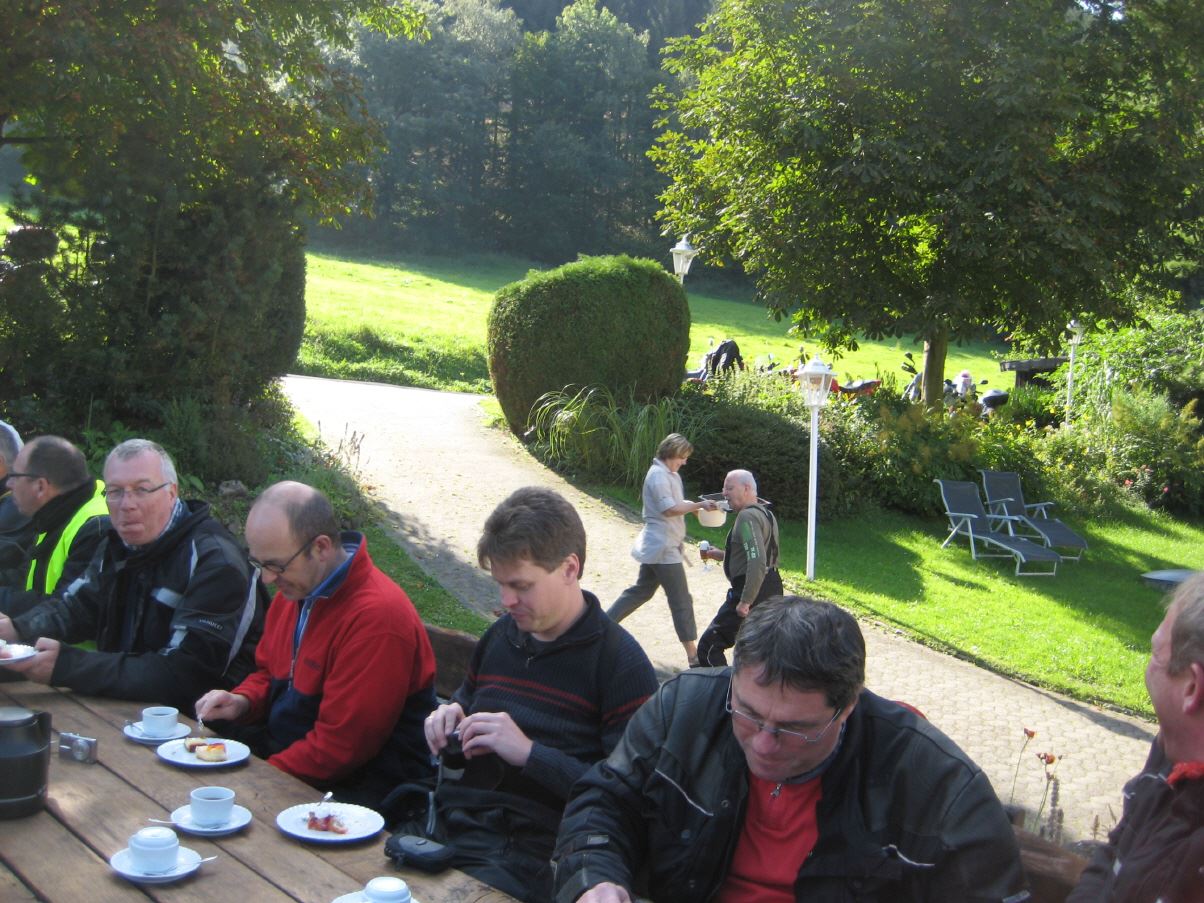 Glücklicherweise verzogen sich dann die Regenwolken und bei blauem Himmel und Sonnenschein startete die 2. Etappe über Rönkhausen/Allendorf... . Nachmittags dann ein weiterer Halt bei dem idyllisch gelegenen Jagdhof Nöcker. in Linneperhütte. Dort wartete auf die Biker schon eine große Kaffeetafel mit hausgemachtem Kuchen.