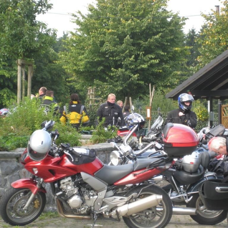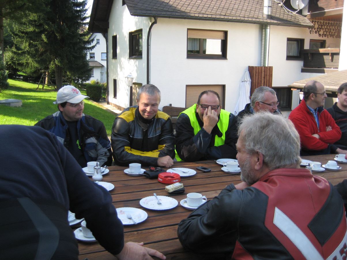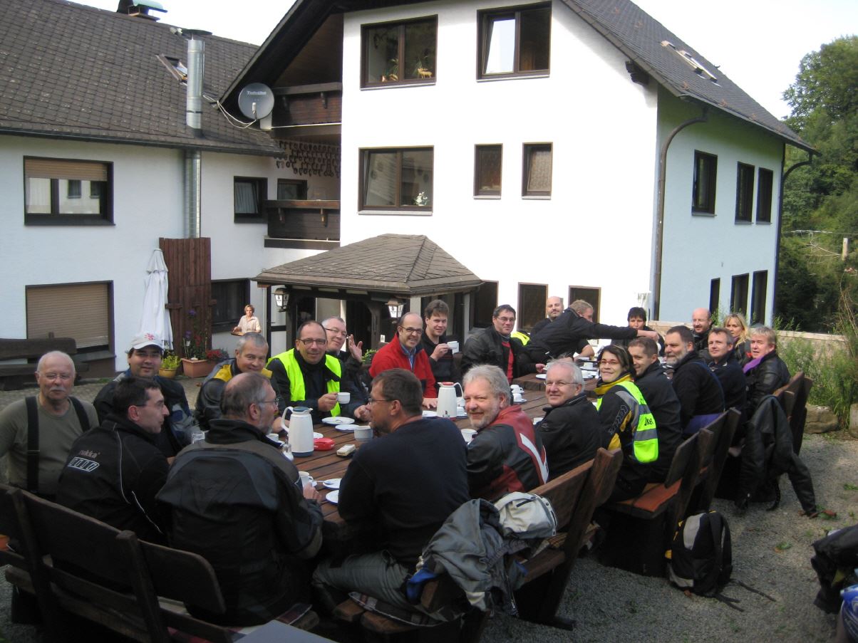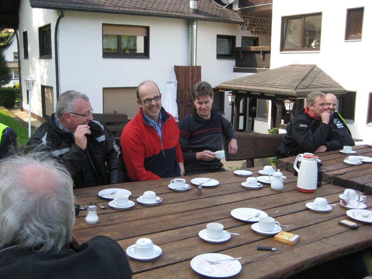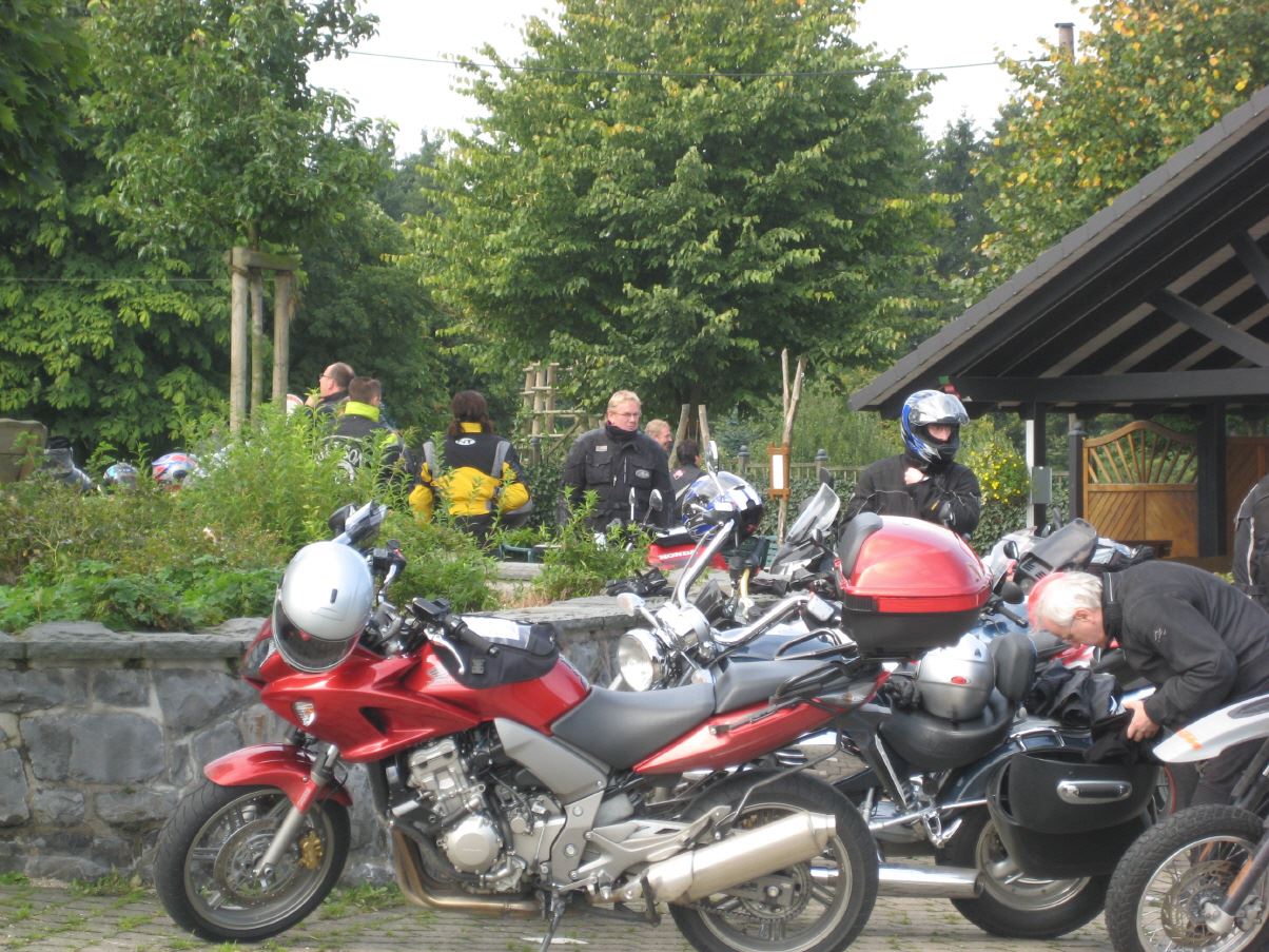 Glücklicherweise verzogen sich dann die Regenwolken und bei blauem Himmel und Sonnenschein startete die 2. Etappe über Rönkhausen/Allendorf... . Nachmittags dann ein weiterer Halt bei dem idyllisch gelegenen Jagdhof Nöcker. in Linneperhütte. Dort wartete auf die Biker schon eine große Kaffeetafel mit hausgemachtem Kuchen.