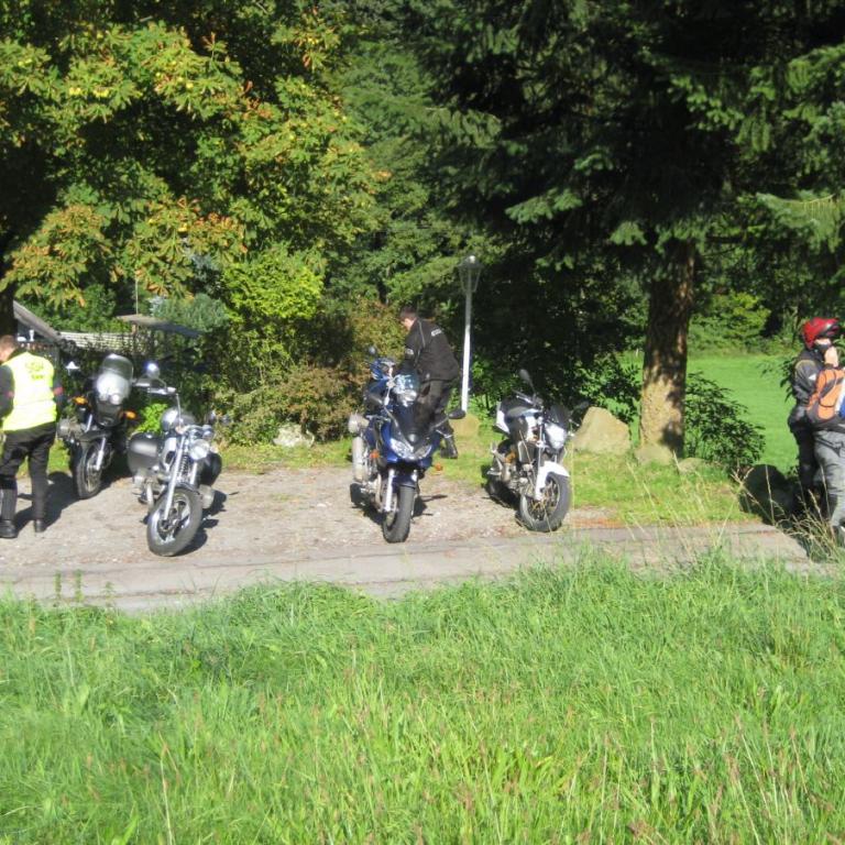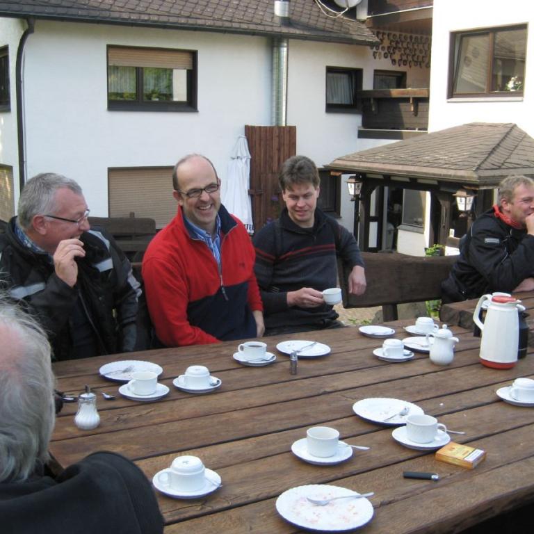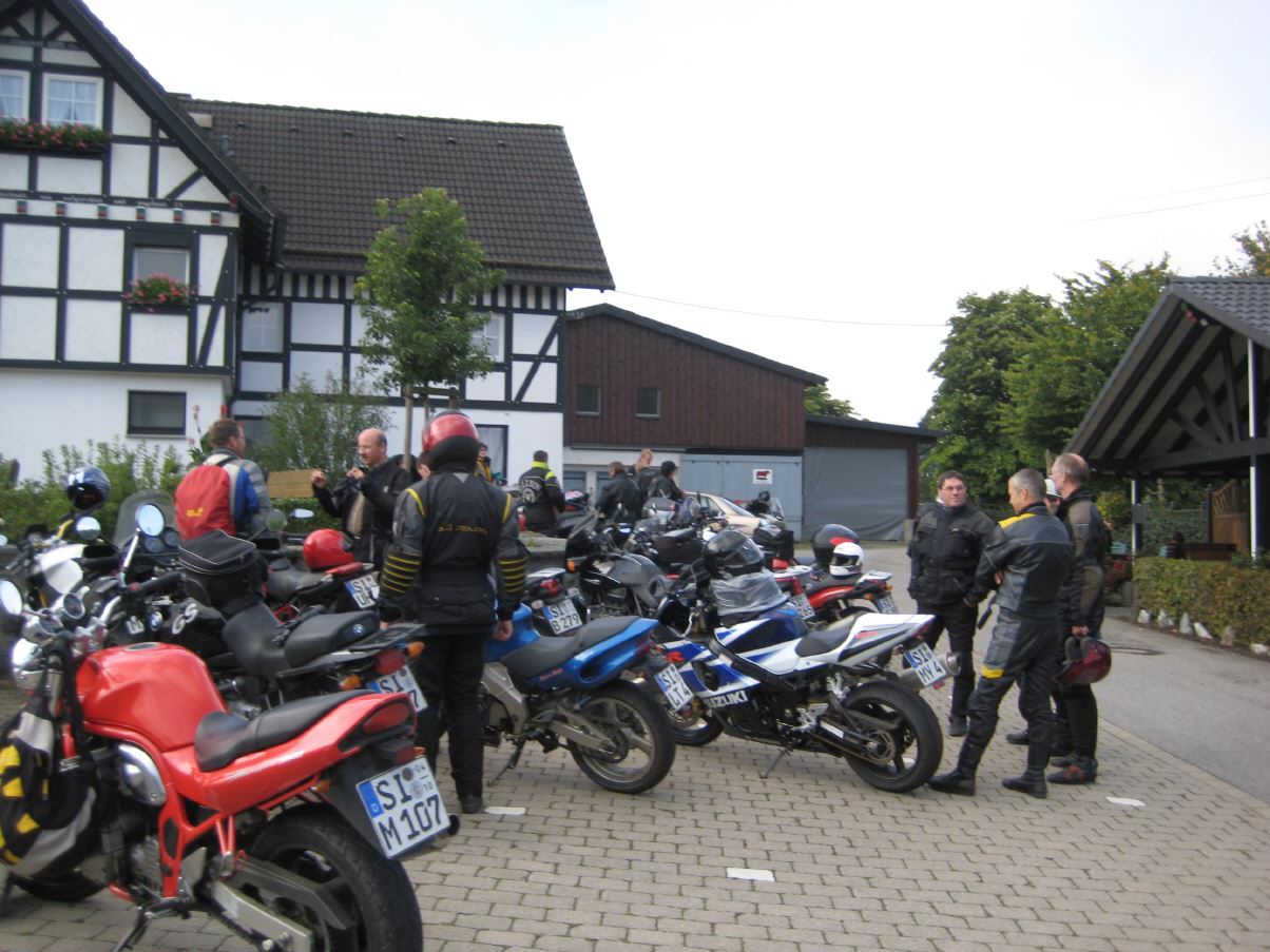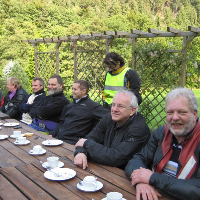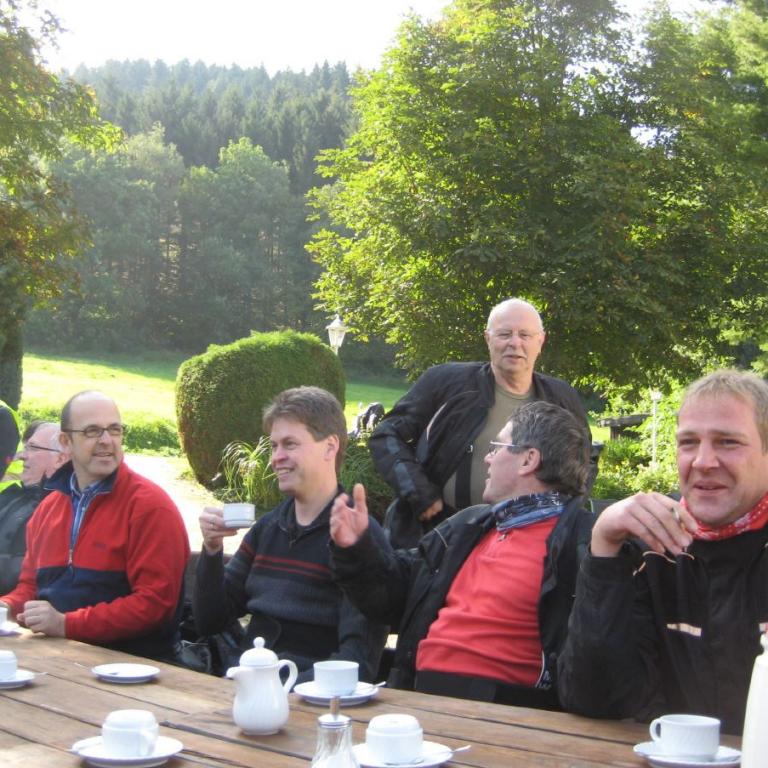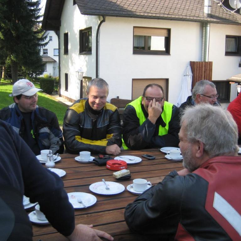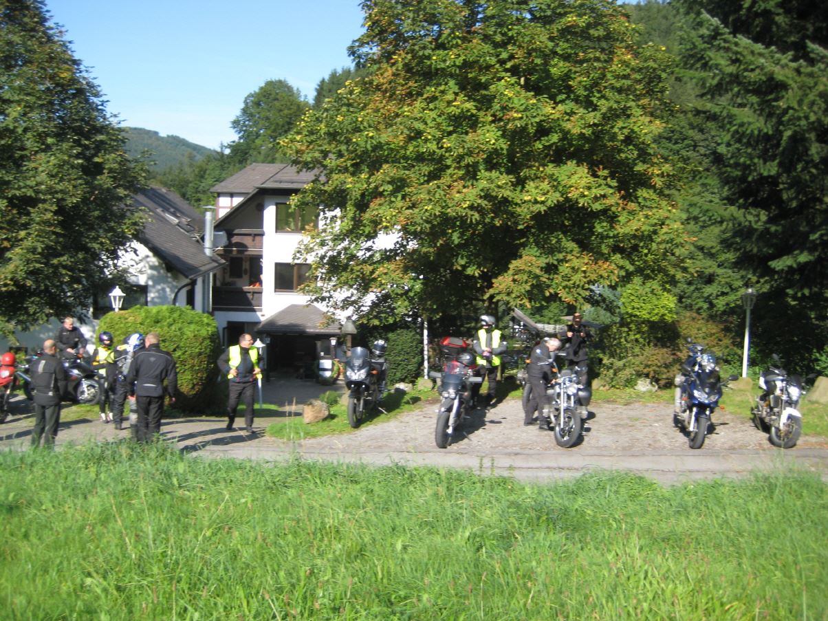 Glücklicherweise verzogen sich dann die Regenwolken und bei blauem Himmel und Sonnenschein startete die 2. Etappe über Rönkhausen/Allendorf... . Nachmittags dann ein weiterer Halt bei dem idyllisch gelegenen Jagdhof Nöcker. in Linneperhütte. Dort wartete auf die Biker schon eine große Kaffeetafel mit hausgemachtem Kuchen.