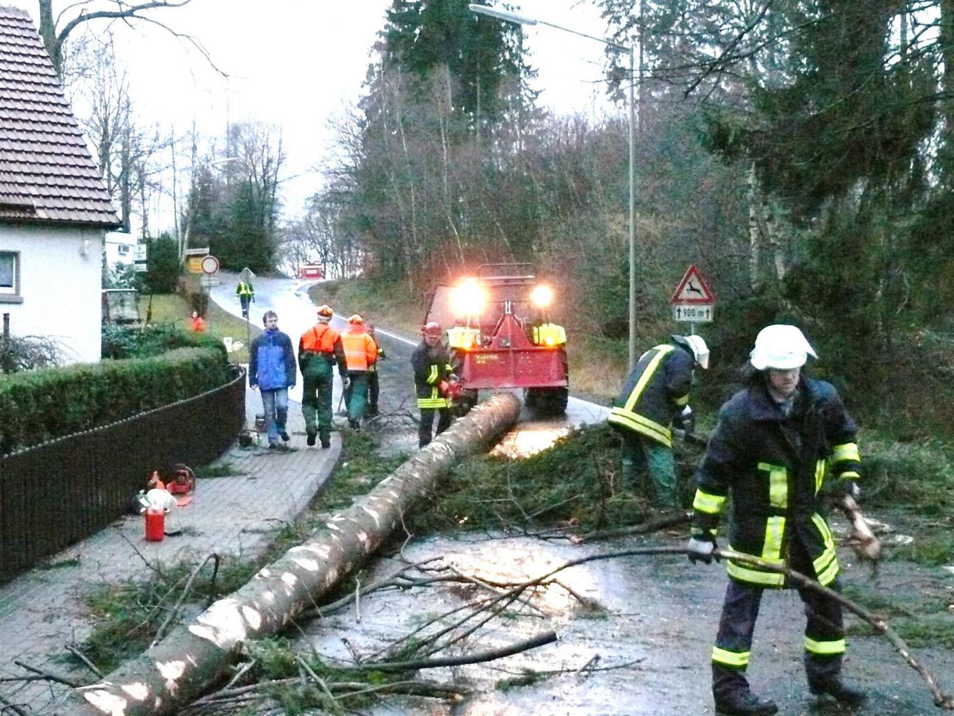 Trotz des vom Orkan verursachten Getöses vernehmen die „Floriansjünger“, dass im Bestand weitere Bäume fallen. Ihr Krachen ist bis auf die Straße zu hören. Zu sehen ist trotz der ins Dunkel gerichteten Scheinwerfer kaum etwas. Einsatzleiter Torsten Stein erkennt sofort, dass für ihn und seine Mannen Lebensgefahr besteht. Kein Mensch weiß, welcher Baum als nächster umgeblasen wird. Wer kann von den Feuerwehrmännern in diesem Ausnahmefall verlangen, im Gefahrenbereich zu verharren?! Falls weitere Bäume auf die Straße fallen, müssen diese bis zum Ende des Sturms liegen bleiben. Einsatzleiter Stein, zugleich Chef des Flammersbacher Löschzugs, bricht sofort den Einsatz ab, es ist die einzig richtige Entscheidung.