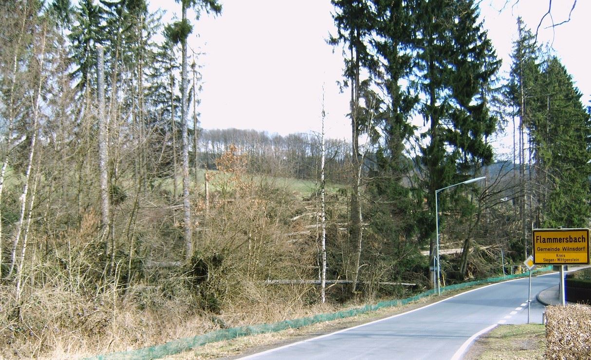 In Flammersbach liegen rund 4.500 Festmeter Fichten mit und ohne Wurzelteller kreuz und quer am Boden. Alle Bestände sind mehr oder weniger stark betroffen. Da dies in der gesamten Region ähnlich aussieht, ist zunächst kaum an entsprechende Maschinen zur Aufarbeitung zu kommen. Oberförster Ahlborn nimmt als Vertreter des Forstamts während der Jahreshauptversammlung der Flammersbacher Waldgenossen wie folgt Stellung: „Der Orkan Kyrill war die bisher größte Katastrophe im Wald Nordrhein-Westfalens. Erfreulicherweise gibt es Zuschüsse des Landes bei der Wiederaufforstung, allerdings nur für Laubholz, nicht aber für Fichten.“