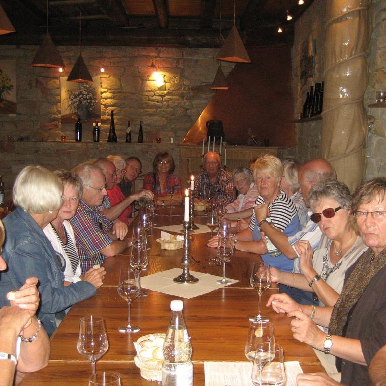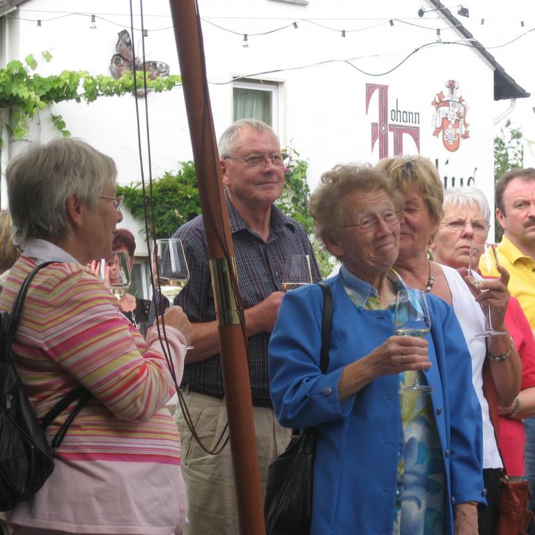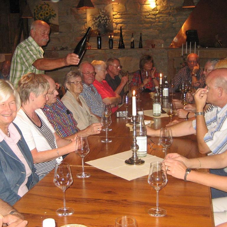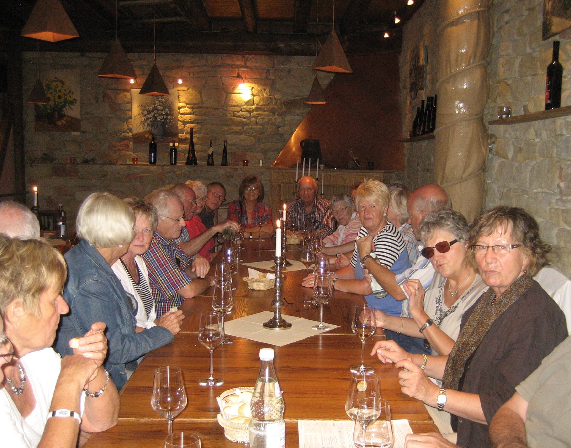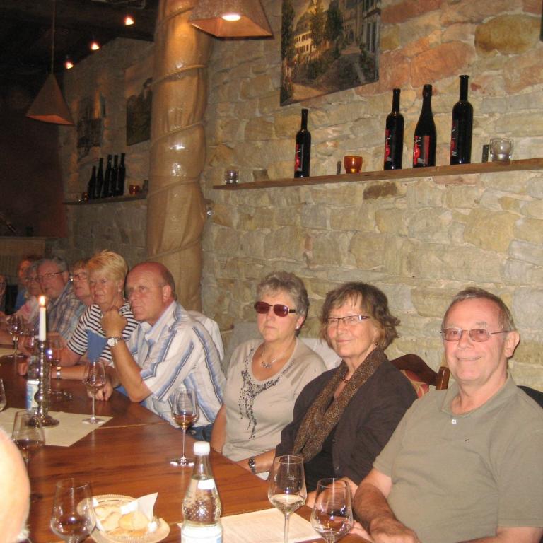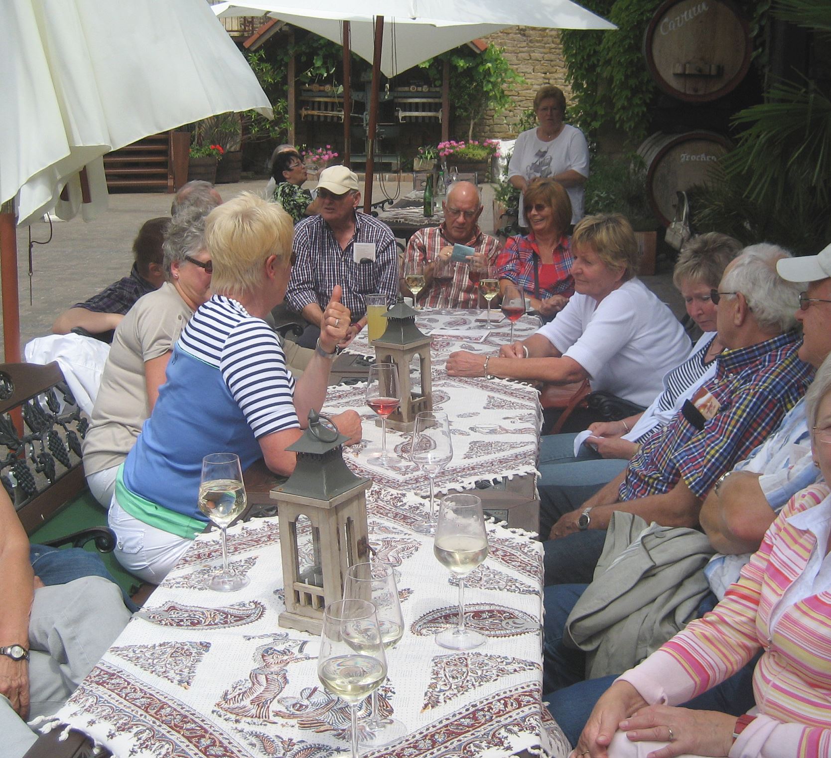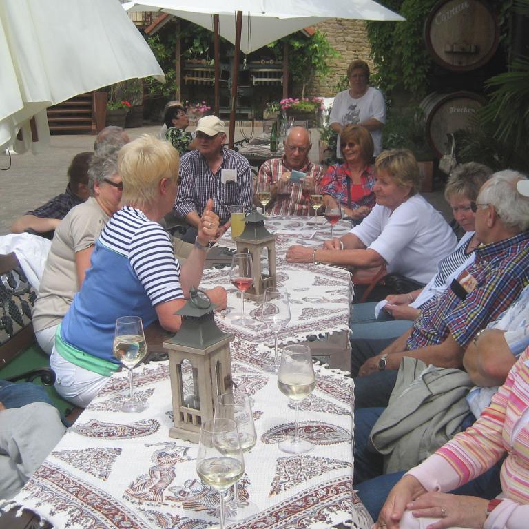 Der Jahresausflug des Singkreises führte uns nach Bad Sobernheim ins Nahetal. Auf einem der schönsten Winzerhöfe Deutschlands - dem Weingut Tullius - wurden wir mit einem Tussecco empfangen. Interessante Verkostungen von Rot- und Weißweinen schlossen sich an. Zwischendurch stärkten wir uns am schmackhaften Bratenbuffet. Nach der Besichtigung vom Winzerhof mit seinem Barriquekeller, dem Refugium und dem Faßkeller ging es mit dem IDEAL-Reisebus weiter zur Kaffeepause in romantische Städtchen Bad Münster am Stein. Durch das Salinental und vorbei an Bad Kreuznach kamen wir um 20 Uhr wieder in Flammersbach an.